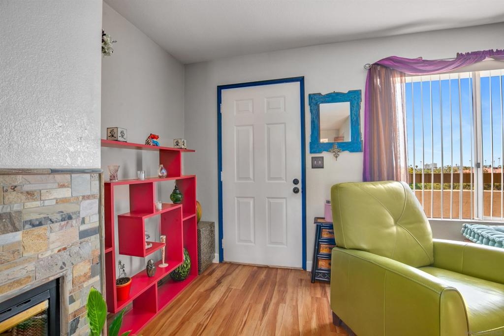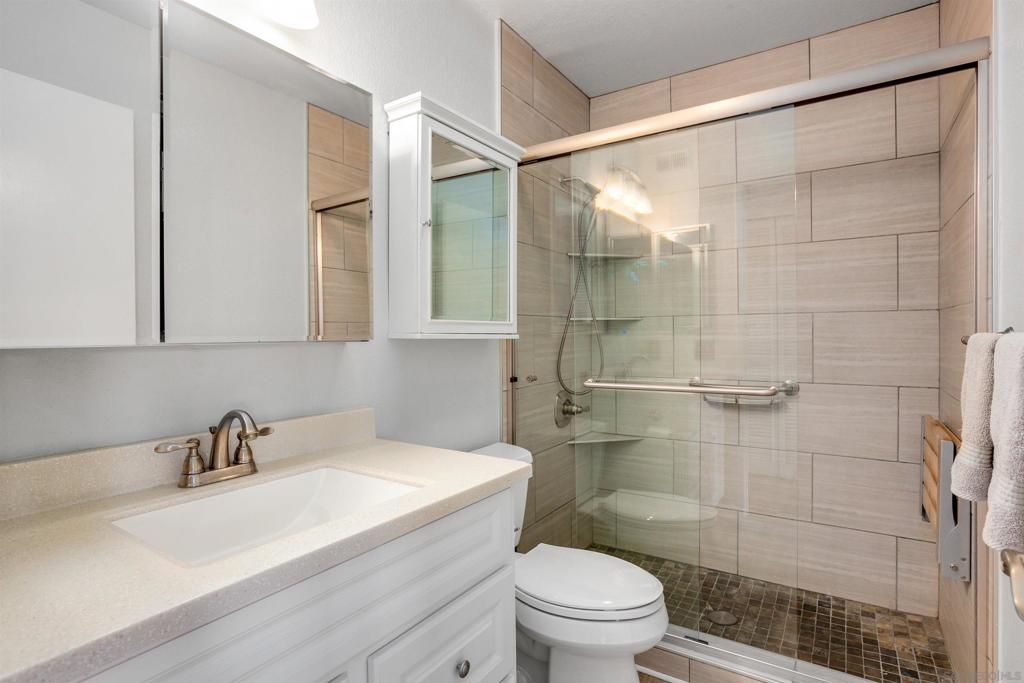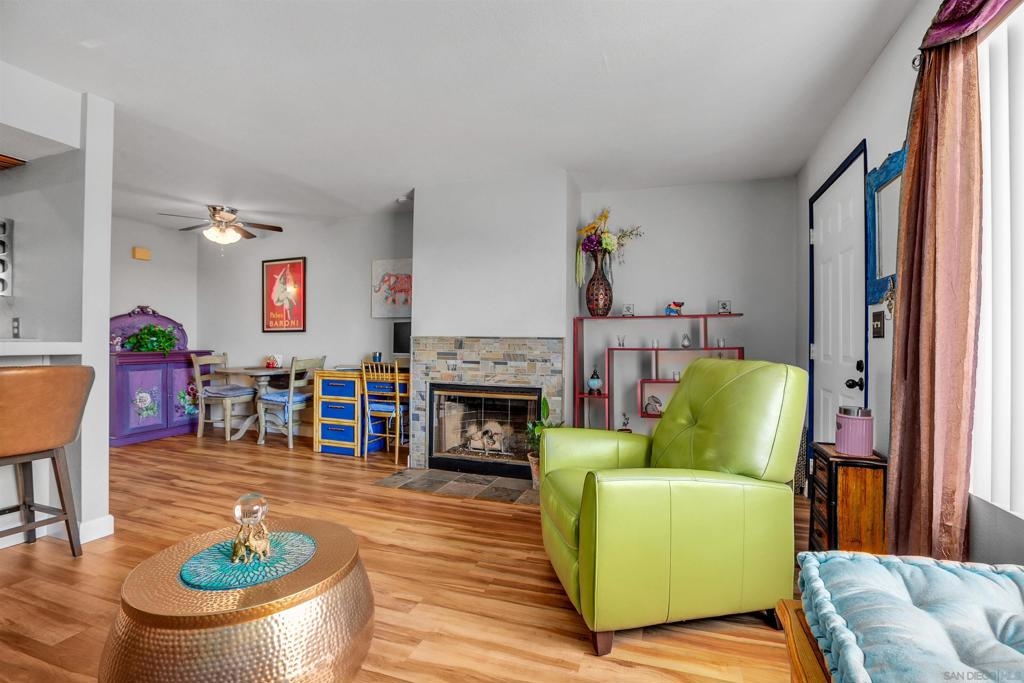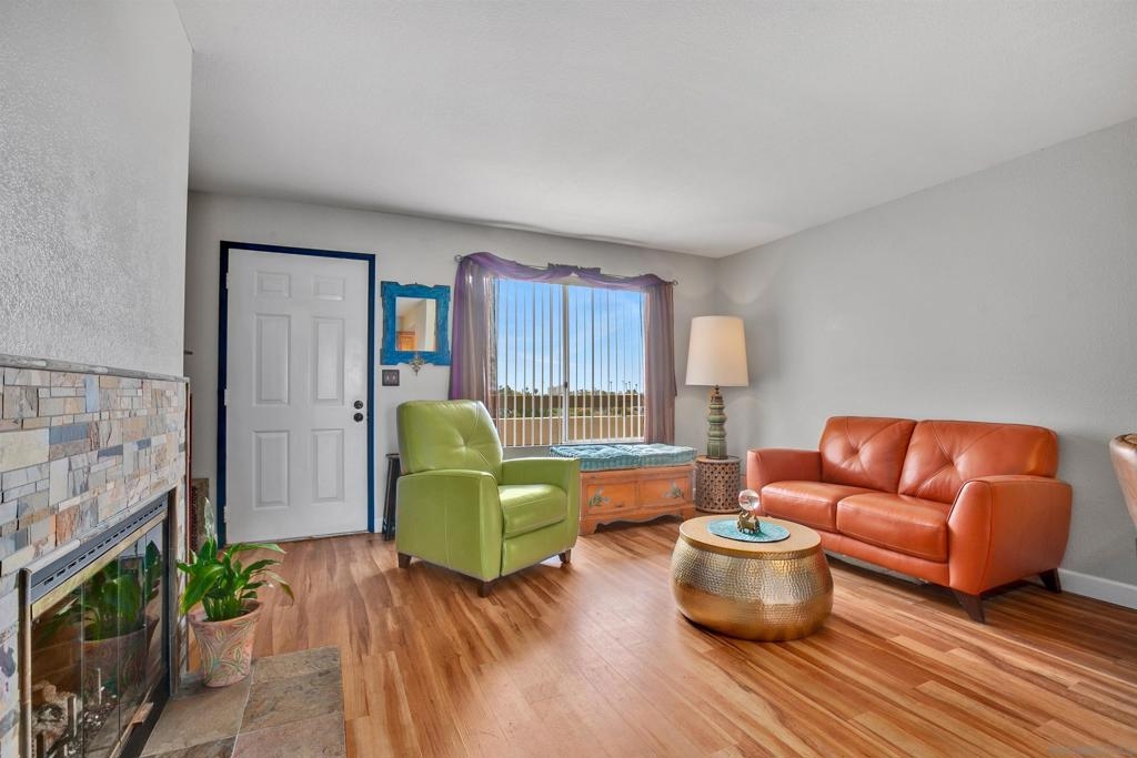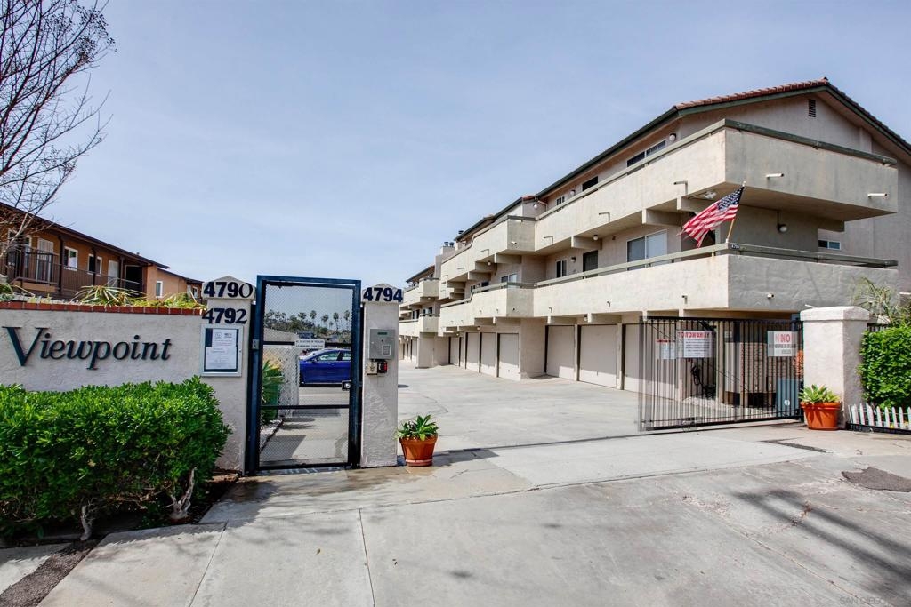 Extra sharp unit in the very desirable Viewpoint development. Extremely neat and clean with laminate wood floors, fireplace with gas starter, sleek remodeled bathroom, stone counters, heat pump, central air conditioning, covered view balcony with wide vistas of Mission Valley and the surrounding hills, security entry screen plus the gated entry driveway. Renovated kitchen ceiling. All appliances included. Great location nestled above Mission Valley & west of Normal Heights. Easy freeway access just minutes from Mission & Fashion Valley shopping, numerous restaurants, the Trolley Barn & public transportation bus to SDSU. Washer/dryer also included. One great unit! Complex Features: ,, Equipment: Dryer, Range/Oven, Washer Sewer: Sewer Connected, Public Sewer Topography: GSL,SSLP Frontage: Canyon, Open Space