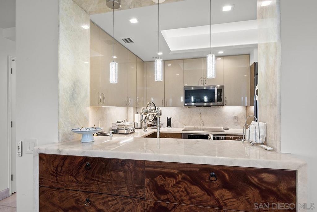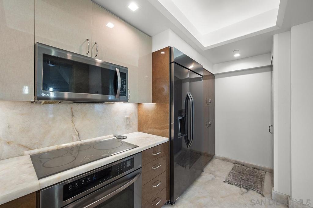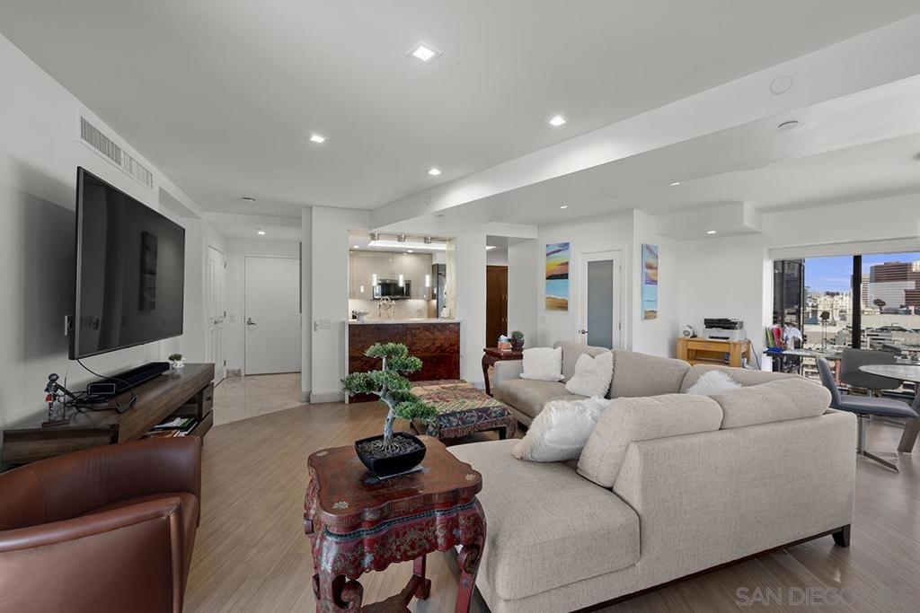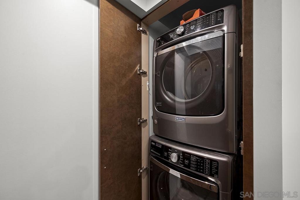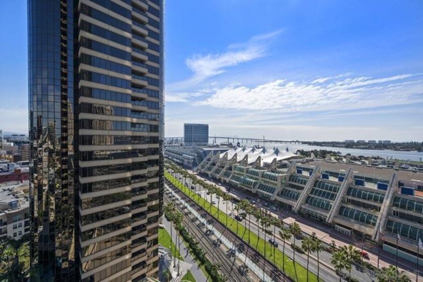 Experience waterfront living at Harbor Club with unobstructed views of San Diego Bay, the Coronado Bridge, and Petco Park beyond the skyline. Banks of windows fill the residence with natural light and frame the ever-changing waterfront, from sailboats gliding by during the day to city lights reflecting on the water at night. The open living area extends to a private balcony, ideal for enjoying the views or hosting guests, while the bedroom also offers direct balcony access, creating a seamless indoor-outdoor connection and a front-row vantage point from sunrise through evening. The kitchen is well appointed with stainless LG appliances, custom marble countertops and backsplash, recessed and under-cabinet lighting, and an eat-at bar with added storage. The primary bedroom features a remodeled ensuite bath with a step-in shower. Additional highlights include an electric fireplace, stackable Maytag washer and dryer, and a secured parking space with EV charging capability. Claim a Marina District home where each day unfolds with water, sunlight, and iconic views. Residents of the Harbor Club are treated to an array of lavish, resort-inspired amenities that encompass a round-the-clock front desk service, a state-of-the-art gymnasium, an exquisite pool deck, a sociable club room, and a versatile library/business center, among numerous other perks. Nestled in the much-coveted Marina District, the Harbor Club boasts unparalleled ease in traversing the neighborhood on foot, granting effortless access to an array of transportation options, delectable dining establishments, retail therapy, the iconic ballpark, the pulsating Gaslamp Quarter, the artsy East Village, and the scenic Embarcadero – an idyllic setting for serene walks alongside the bay.