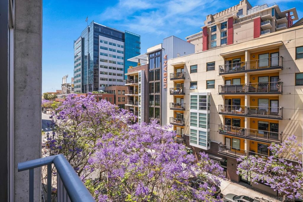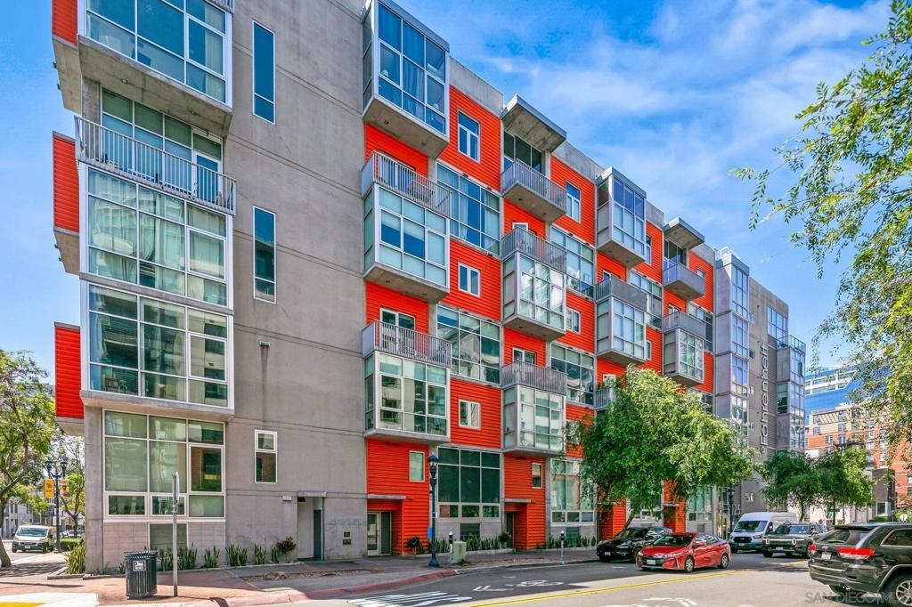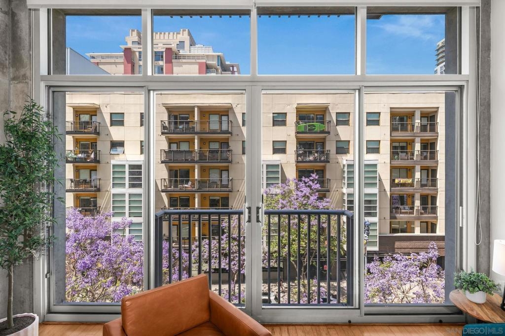 A modern loft with a distinctly urban point of view, this East Village residence pairs industrial texture with natural light and open spatial flow. Exposed 11-foot cement ceilings and walls create a striking architectural backdrop, while floor-to-ceiling windows bring in sunlight and showcase city skyline views. The open-concept floor plan flows seamlessly between the kitchen, dining, and living areas, offering both flexibility and ease. Dual sliding doors open to a Juliet balcony, creating a subtle indoor-outdoor connection and inviting fresh air into the space. A thoughtful blend of volume, light, and downtown energy defines this unique home. Located in a vibrant neighborhood, you'll have easy access to top-rated restaurants, trendy boutiques, and cultural hotspots. Plus, with off-street parking included, you can explore all that downtown has to offer without any hassle. Fahrenheit is one of Downtown San Diego's most notable condo buildings and a recipient of a prestigious design award from the American Institute of Architects. It's central location is just 2 blocks from PetCo Park, and a short walk to the Bayfront, Gaslamp Quarter and Little Italy. It has one of the lowest monthly HOA fees in the East Village.