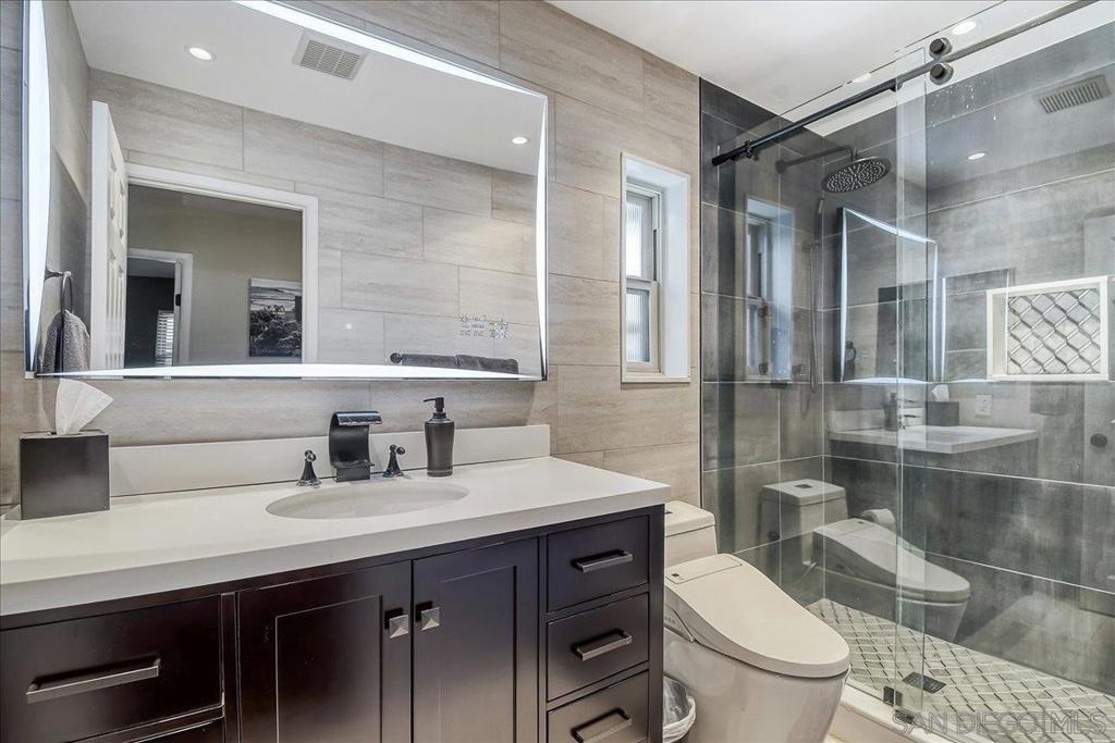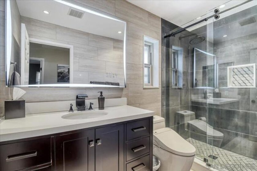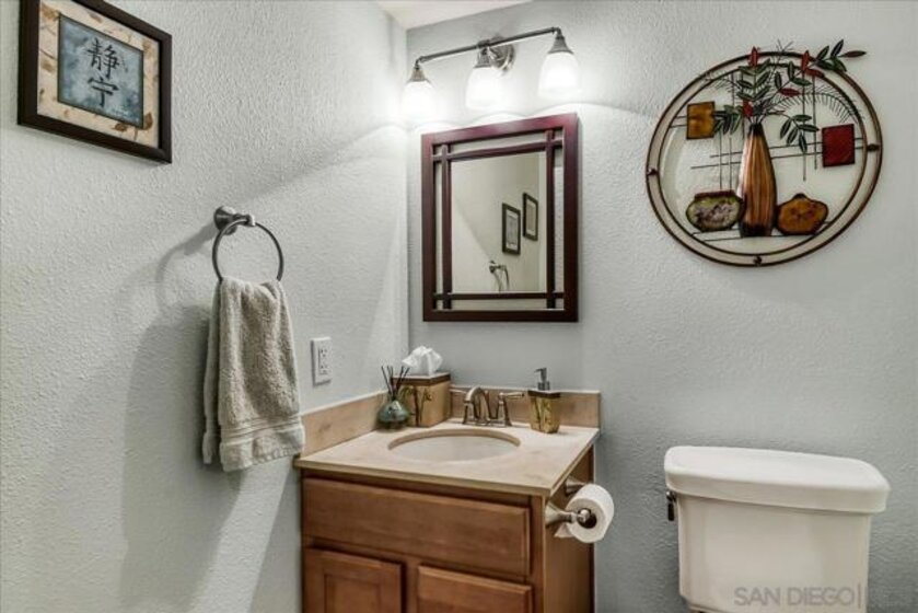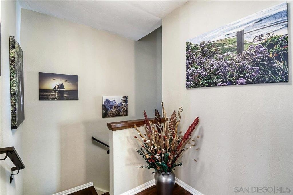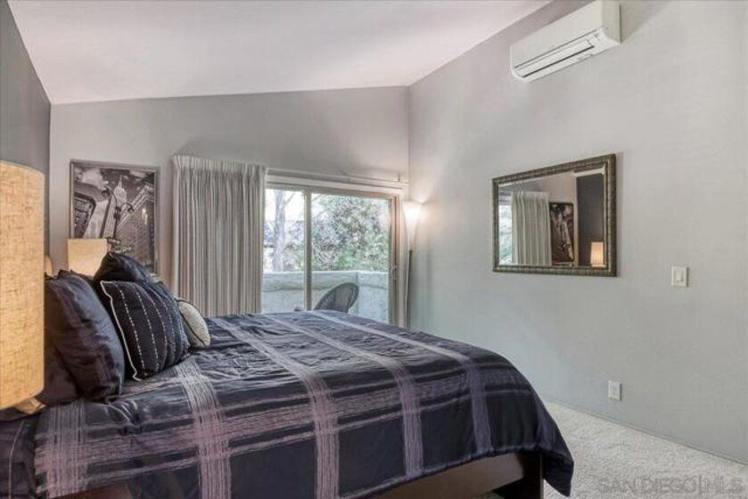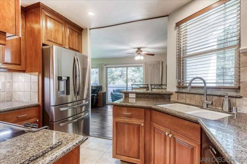 Spectacular location END unit town home with VIEWS in the highly desired complex of North Rim. Includes 2 bedrooms, 1.5 bath 1,098 square feet of living space. This prime peaceful park like location offers with direct access to the home. The Kitchen is upgraded with granite counters, custom cabinetry and stainless steel appliances. Beautiful laminate wood flooring on main floor. Custom stone textured wall in living room and custom stone fireplace. Mini split units with Heating and Air conditioning. Two decks offer outdoor living, vaulted master bedroom ceiling, and the greenbelt views add to its charm. Primary bedroom has a walk in closet and balcony. The Bathroom is remodeled with modern tiles, flooring and shower fixtures. Custom mirrored lighting. Large 2 car garage has custom flooring and a custom barn door with full size washer and dryer. Located above Fashion Valley, minutes drive to Mission Bay, Mission Valley, Downtown and within walking distance to Frances Parker & USD. North Rim includes resort style amenities with a gorgeous pool and spa, clubhouse for entertaining large groups and tennis courts.