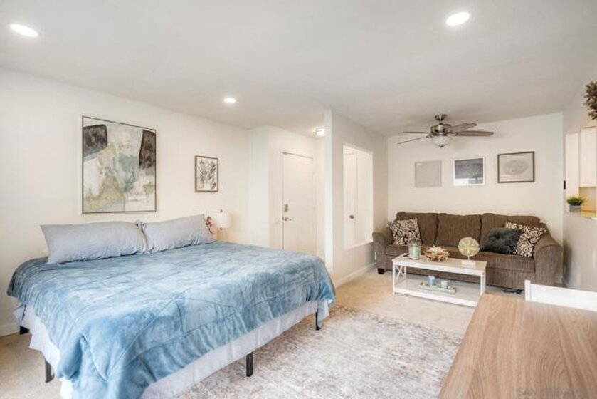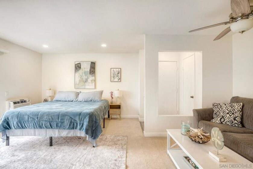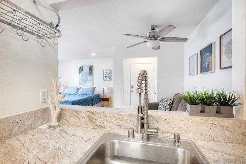 Lovely studio condo in the heart of Mission Valley, over 500 q ft with a private balcony, open concept kitchen with stainless appliances and granite countertops, new paint, new carpet, and a lovely bathroom and 1 assigned parking pace.