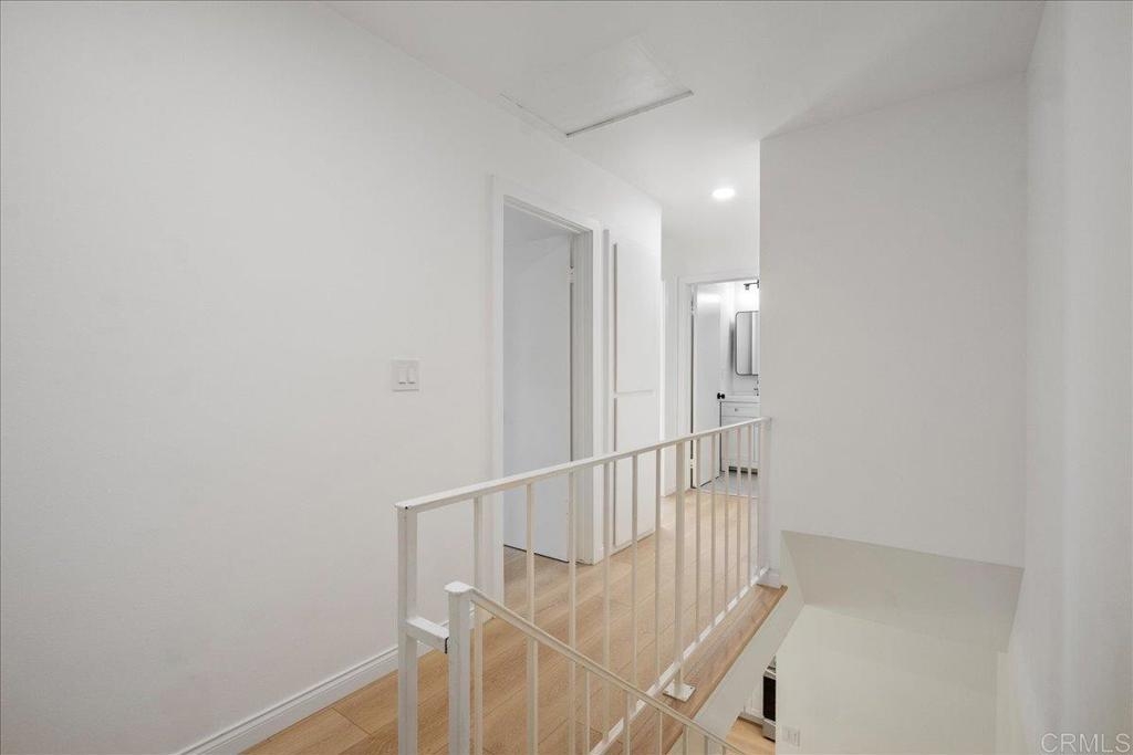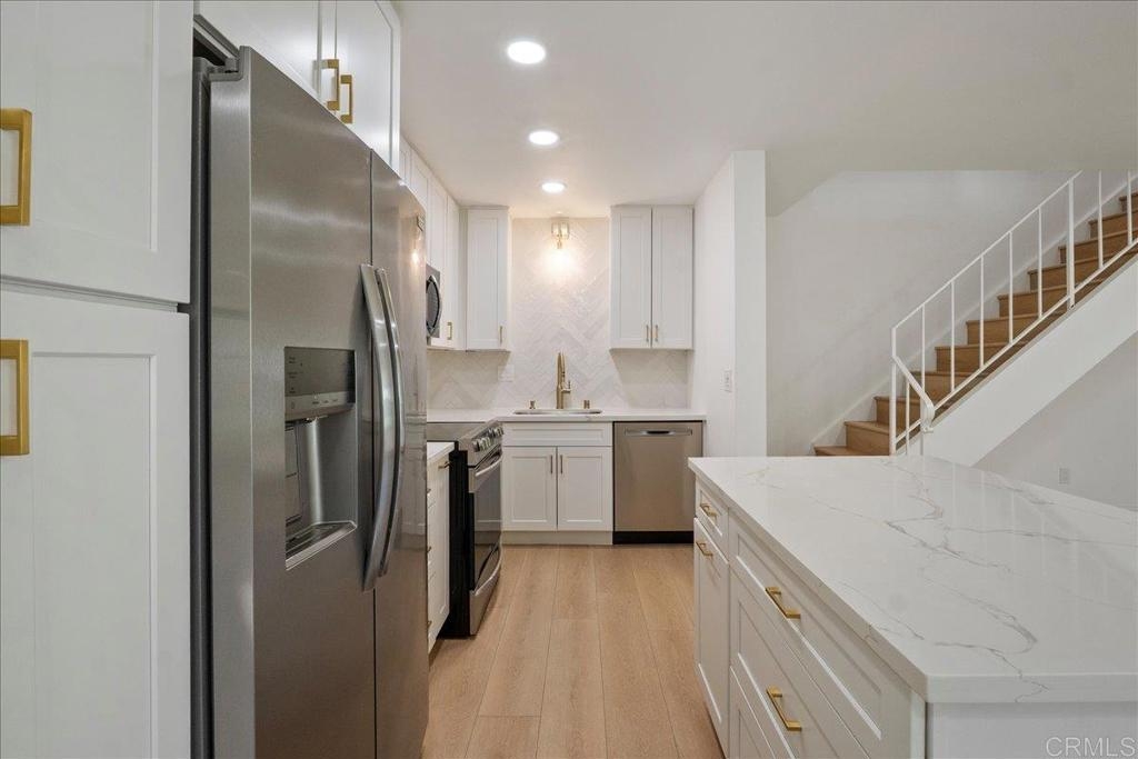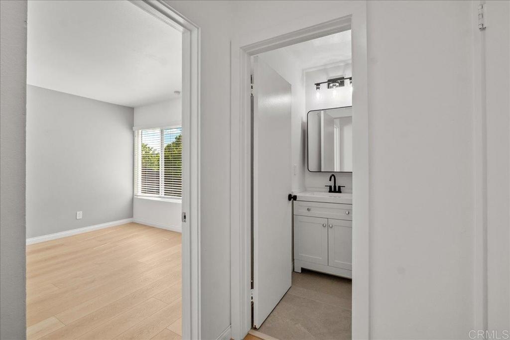 Tucked into a quiet, tree-lined, park-like setting, this beautifully remodeled end-unit condo lives more like a townhome than a typical condo. With no one above you and all bedrooms thoughtfully located upstairs, the layout offers both privacy and flow. Step inside to a bright, open-concept living space where the kitchen, dining, and living areas blend seamlessly together. The remodeled kitchen shines with crisp white finishes, quartz countertops, new lighting and a fresh, modern feel. The bathroom has been tastefully updated in the same clean, contemporary style, designer tiles, creating a cohesive and move-in-ready home. Natural light pours in, peace and quiet with no one above you, the surrounding greenery gives the home almost retreat-like vibe. Positioned in the quietest part of this community. Location is everything. Practicality meets lifestyle with a shared garage and laundry, plus easy free parking. Located just 8 miles from Torrey Pines State Beach. And with access to the highly acclaimed Poway Unified School District, this home checks boxes for both lifestyle and long-term value. Whether you’re stepping into homeownership for the first time or looking for a smart investment in a prime San Diego location, this one hits that sweet spot. SB 326 repairs have all been completed. VA Approved.