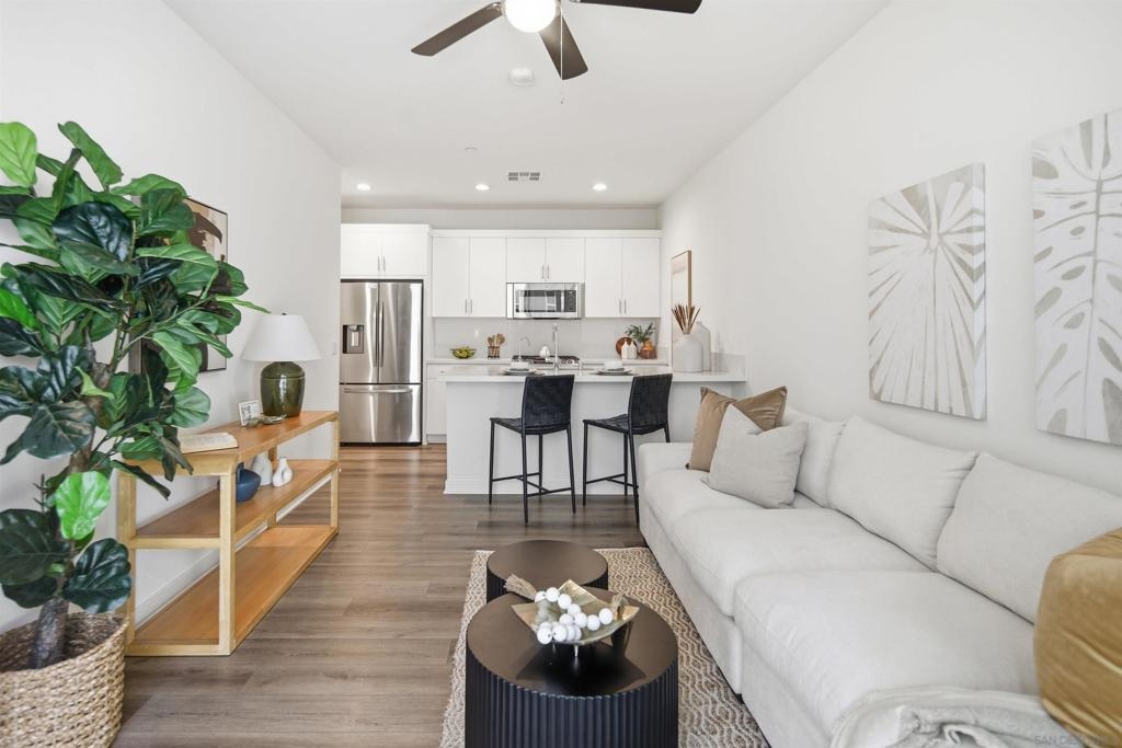 Modern Living At Marquee Welcome home to this stylish one bedroom plus loft, 1.5 bath residence in the highly desirable Marquee at Civita. Designed with modern living in mind, this light filled home features an open concept layout with luxury vinyl plank flooring throughout the main living level and brand new plush carpet on the stairs and upper floor for added comfort. The contemporary kitchen anchors the space with sleek cabinetry, stainless steel appliances, gas range, quartz countertops, and a spacious peninsula that flows seamlessly into the living area and out to your private patio, creating the perfect setup for entertaining or relaxing indoors and out. Upstairs, the primary suite offers a peaceful retreat complete with an ensuite bathroom, dual vanity, and generous walk in closet. The versatile loft provides endless possibilities and works beautifully as a home office, guest space, or creative studio. A convenient half bath on the main level adds functionality, while the attached oversized one car garage offers excellent storage and everyday ease. Located in one of San Diego’s most vibrant master planned communities, this thoughtfully designed home delivers modern comfort, flexible living space, and an unbeatable lifestyle. A rare opportunity to own a beautifully appointed residence in Civita. Civita in Mission Valley Marquee is a contemporary residential community located within Civita, Mission Valley’s vibrant and thoughtfully designed master planned neighborhood. Known for its walkable layout and lifestyle focused design, Civita offers residents everyday convenience with a mix of restaurants, boutique shops, a veterinary clinic, and LA Fitness, all just steps from home. One of the standout benefits of living at Marquee is its close proximity to The Row, Civita’s highly anticipated retail and dining destination, anchored by Jimbo’s Naturally. This will be a go to hub for organic groceries, dining, and neighborhood gathering, all just a very short walk away. Just beyond The Row sits the Civita Recreation Center, where residents enjoy resort style pools, spa, fitness center, BBQ areas, lounges, and community spaces designed for both relaxation and connection. At the heart of the neighborhood is Civita Park, an expansive green space featuring walking trails, gardens, amphitheaters, courts, and open lawns that host community events year round. Centrally located in Mission Valley, Civita offers easy access to beaches, downtown San Diego, Snapdragon Stadium, and major freeways, creating a lifestyle that balances urban convenience with outdoor living.