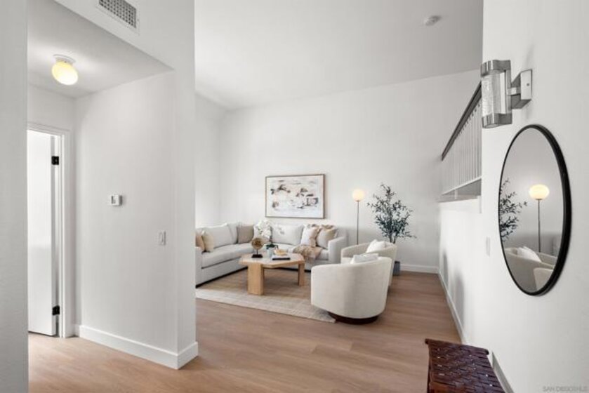 Welcome to the highly sought-after Mariposa community, ideally located near Allied Gardens, Del Cerro, and Mission Trails Regional Park. This attached single-family home is FHA and VA approved and offers 1,950 sq ft. of thoughtfully updated living space, in a spacious 3-story split-level layout. Privately positioned as an end-unit corner home, it shares only 1 wall and enjoys unobstructed westerly views over open space, bringing in natural light and a sense of privacy. The inviting living room features dramatic 20-foot ceilings, brand new luxury vinyl plank flooring, and fresh interior paint throughout. The beautifully renovated eat-in kitchen showcases granite countertops, stainless steel appliances, and a stylish bar with pendant lighting that comfortably seats four—perfect for casual dining or entertaining. The kitchen flows seamlessly into the spacious family room with recessed lighting and a cozy gas fireplace, while a formal dining area offers additional space for gatherings and special occasions. Upstairs you’ll find all 3 bedrooms, 2 full bathrooms, and a versatile loft ideal for a home office, media space, or play area. The primary suite offers vaulted ceilings, abundant closet space including a walk-in closet, and a semi-remodeled bath featuring dual sinks, quartz countertops, and a separate shower. Additional highlights include Central AC/Heat, a bonus interior storage area, full-size laundry, and an attached 2-Car Garage with direct access. Amenities include well-maintained grounds, including a large community pool, spa, and clubhouse!