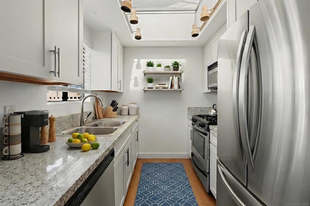 Experience the ultimate in urban living in the heart of North Park! This beautifully updated second-level unit features fresh new paint and stunning vinyl plank flooring throughout. This two bedroom / two bath home is filled with natural light, thanks to thoughtfully placed skylights in the kitchen and light tunnels in all bathrooms and the primary closet. The kitchen shines with white cabinets, solid surface counters, and stainless steel appliances. Plus parking is easy with your own one-car garage. This home is perfectly situated within a short distance to North Park's vibrant cafes, restaurants, and shopping, and just minutes from Morley Field, the San Diego Zoo, Mission Valley, and the 805 freeway. This home offers the best of city living!