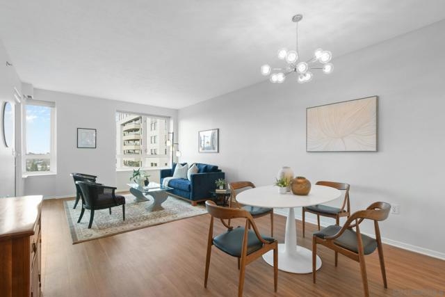 Bright and contemporary 13th floor condo with gorgeous sunset views! This 2 bedroom, 2 bath home offers a gracious layout and amazing westerly views from your living room and both bedrooms. Pacific Regent La Jolla is a luxurious resort style, full service, 62+ independent living community with amenities galore. Offering 24/7 security, valet parking service for residents and guests, a heated indoor pool and spa, exercise/fitness center, on-site restaurant, a beauty salon and more, this single level (no stairs) condo is beautifully updated and move-in ready. An open kitchen layout, spacious living and dining area and a covered balcony make this a popular floor plan. The second bedroom is accessed from the living room and also functions well as a cozy den or office. Paint and flooring were updated in 2023. The spacious balcony, open to the living room as well as to bedroom two/den, offers wonderful views and a shady tucked in corner perfect for a small container garden. Weekly one-hour housekeeping service, concierge services, a library, several outdoor lounge areas and weekly cultural outings are among resident amenities. Scheduled transportation to medical centers, markets and local attractions is also available.