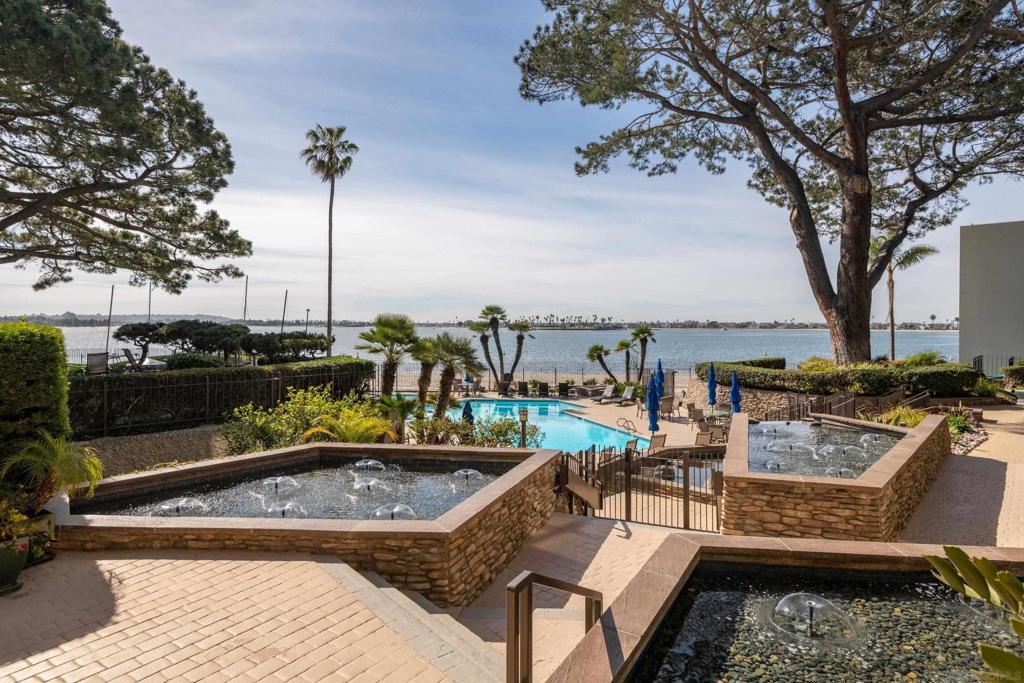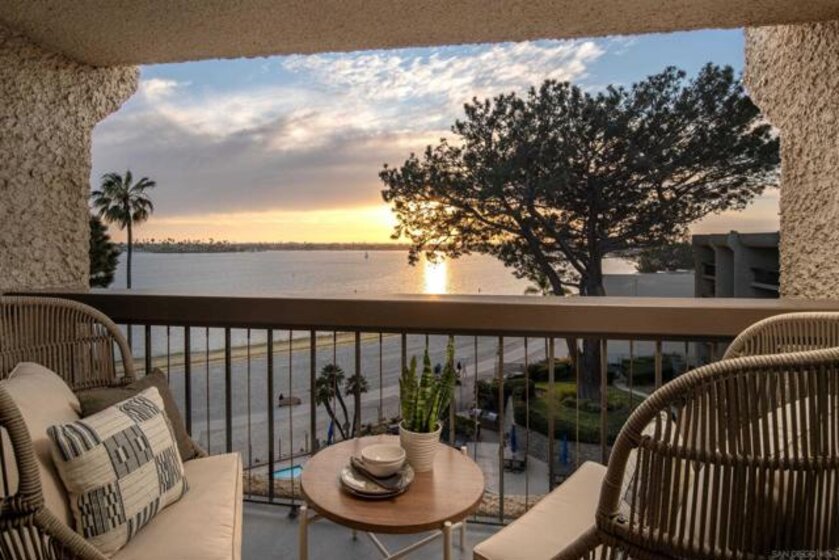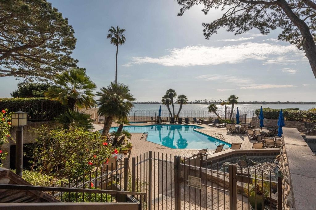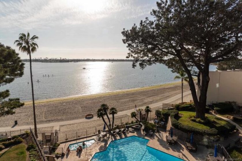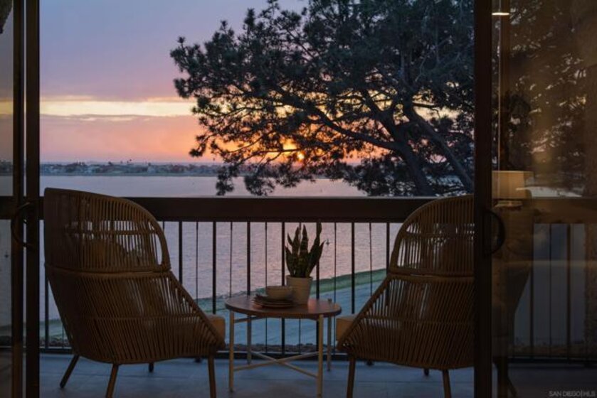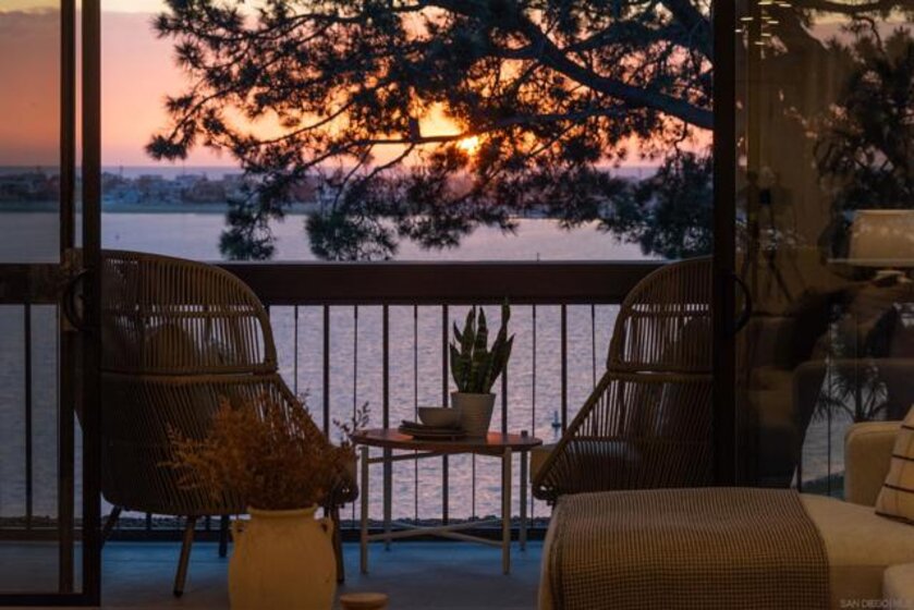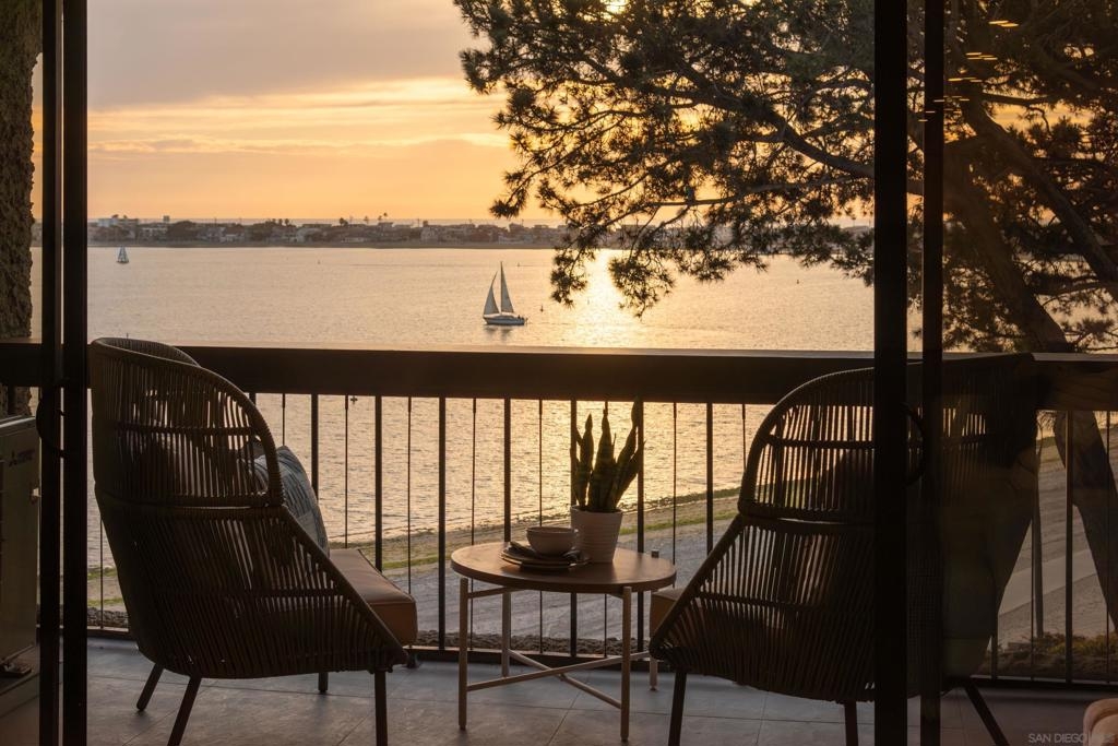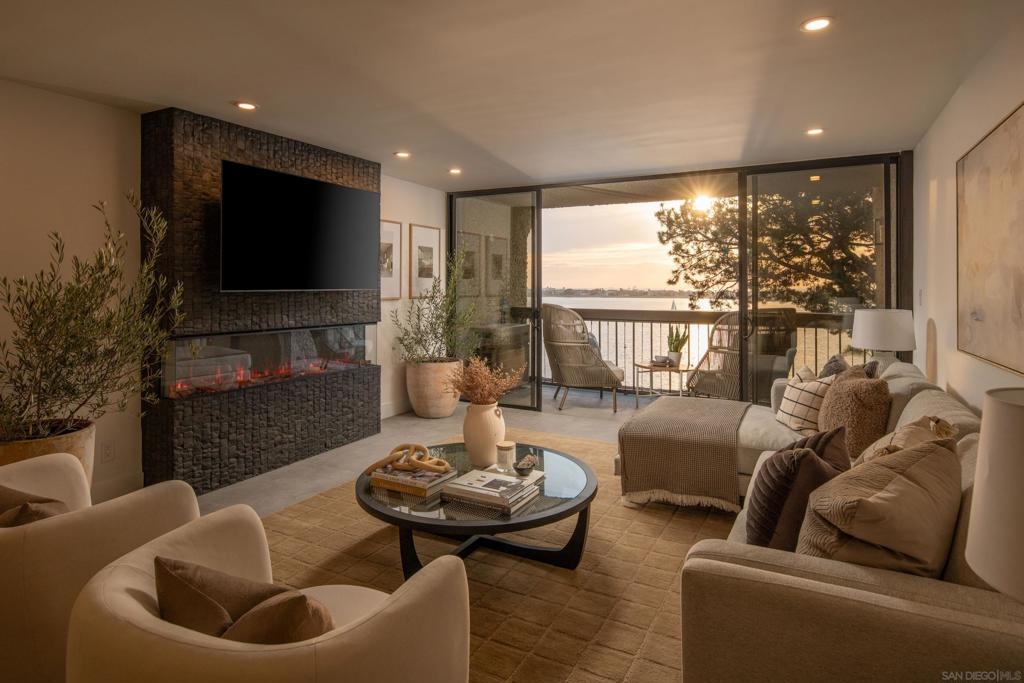 Perched on the top floor of Bay Scene directly on Sail Bay, this rare residence offers one of the most coveted view lines in the community — sweeping western-facing bay vistas with ocean views beyond. Spanning 1,559 square feet, this completely remodeled 2-bedroom, 2-bath home is the ultimate coastal retreat, blending sexy Hawaiian-inspired design with modern beachfront luxury. The open living space is anchored by a dramatic stone-clad fireplace and flows seamlessly into a show-stopping kitchen featuring brand-new contrasting black and warm wood-tone cabinetry, lava rock leather-finish countertops, and sleek black Café Series appliances. Designed for both entertaining and everyday living, the layout captures breathtaking sunsets and shimmering water views from nearly every room. The primary suite is a true sanctuary with a walk-in closet and a spa-inspired bathroom showcasing gorgeous tile work, a Restoration Hardware vanity, and West Elm lighting. The guest bathroom is equally refined with elevated finishes throughout. A dedicated laundry room and generous storage complete the home’s effortless functionality. Residents enjoy resort-style community amenities including a pool, spa, outdoor showers, barbecues, recreation room, and fitness room — perfect for relaxing, entertaining, and embracing the coastal lifestyle. Whether as a full-time residence or the perfect lock-and-leave second home, this home delivers an unparalleled Sail Bay lifestyle — where every day feels like a luxury beachfront getaway.