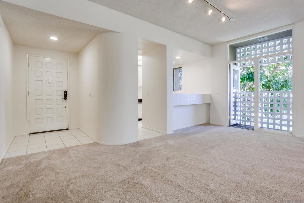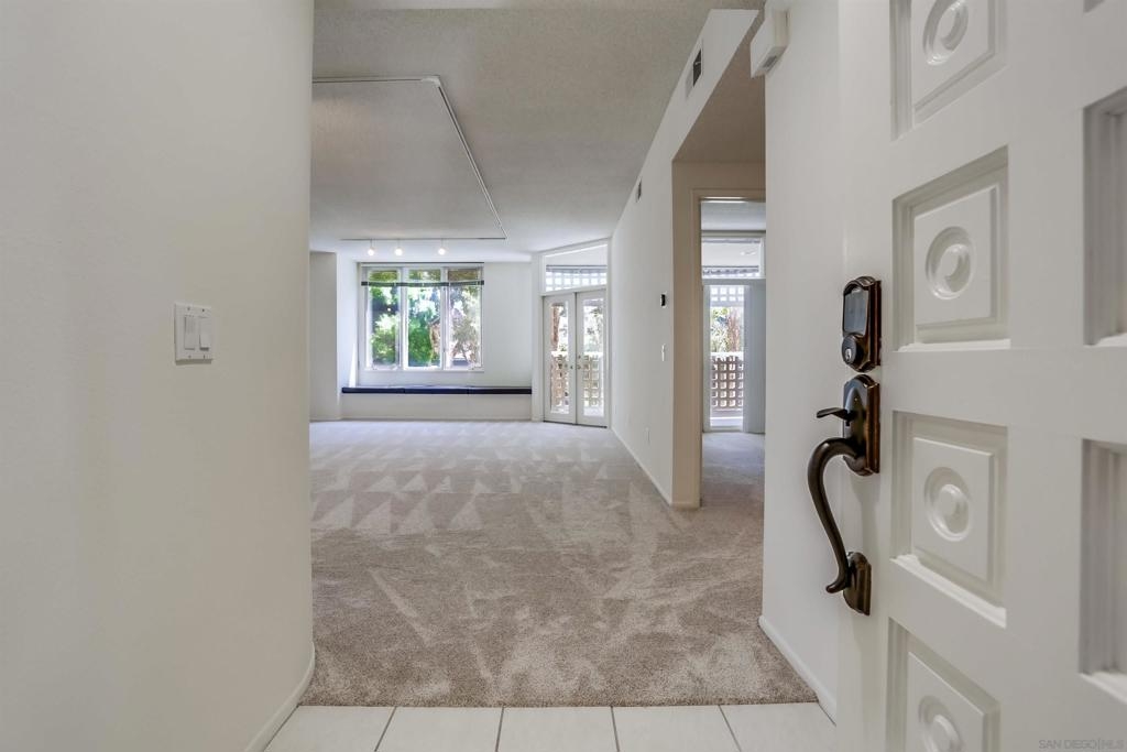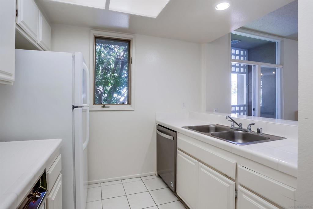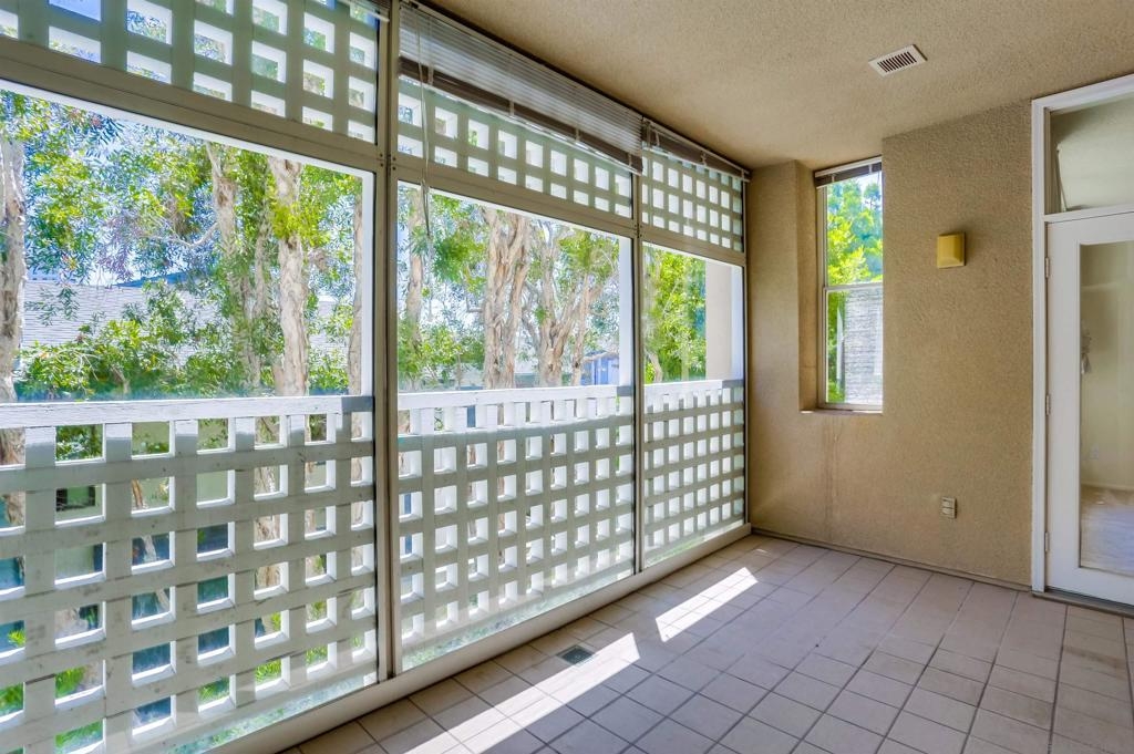 Quiet bright 2nd floor condo in great condition enclosed sun-room. Full kitchen appliances, tile counters, high ceilings, A/C, track lighting, full size washer & dryer, Hot water & trash included. 2 assigned parking spaces in under ground garage, very nice complex has pool, spa & tennis court. Close to UCSD shuttle stops, near Fwy 5 and UTC Mall. The spacious quiet unit in back of the complex not facing busy street, elevator close, peaceful relaxing huge water fountain sparkling at court yard & entrance.