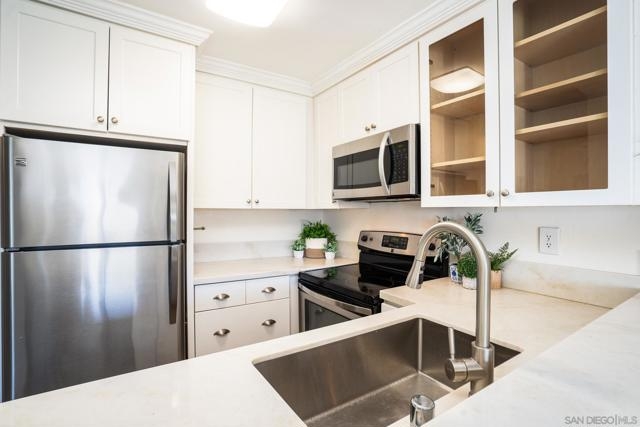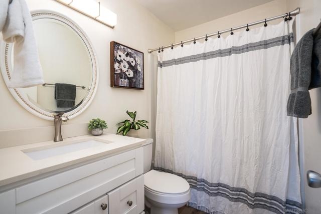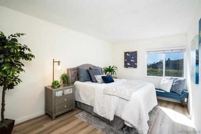 Welcome to your Bay Ho sanctuary where panoramic bay views and sparkling SeaWorld fireworks become part of your everyday living experience in this exceptionally bright, first-floor corner unit. Walk to the infamous Lazy-Eye coffee featuring breakfast burritos and more! Western and southwestern bay views greet you through expansive windows that flood the space with natural light, while your private patio offers front-row seating for SeaWorld's nightly fireworks and breathtaking sunsets over the bay and hillsides. The open-concept floor plan features a dedicated dining area flowing into the updated kitchen with brand-new countertops and sunny breakfast nook. The split-bedroom layout places both bedrooms on opposite sides with private ensuite bathrooms—a true dual-primary suite configuration ideal for roommates, couples, or guests. Interior laundry hookups, first-floor location with elevator access provides easy living. Recent HOA upgrades include fully compliant balconies and railings per California SB 326. Walk to bay-view dog parks and exceptional dining including top-rated sushi, drive five minutes to Bay Park restaurants, ten minutes to Pacific Beach shores, or fifteen minutes to airport and downtown. Quick freeway access connects you to everything San Diego offers. Bay Ho Condominiums is dog friendly community. Enjoy the sparkling community pool and oversized spa. Impeccably maintained, this turn-key home is perfect for young professionals, couples, investors, retirees, or as your ideal San Diego vacation property.