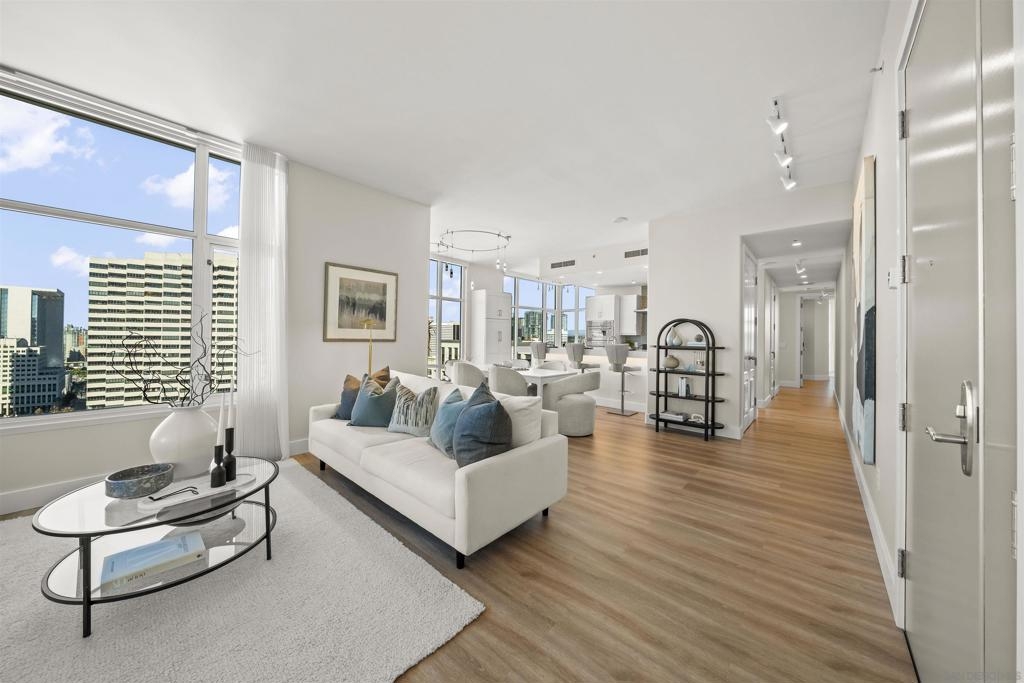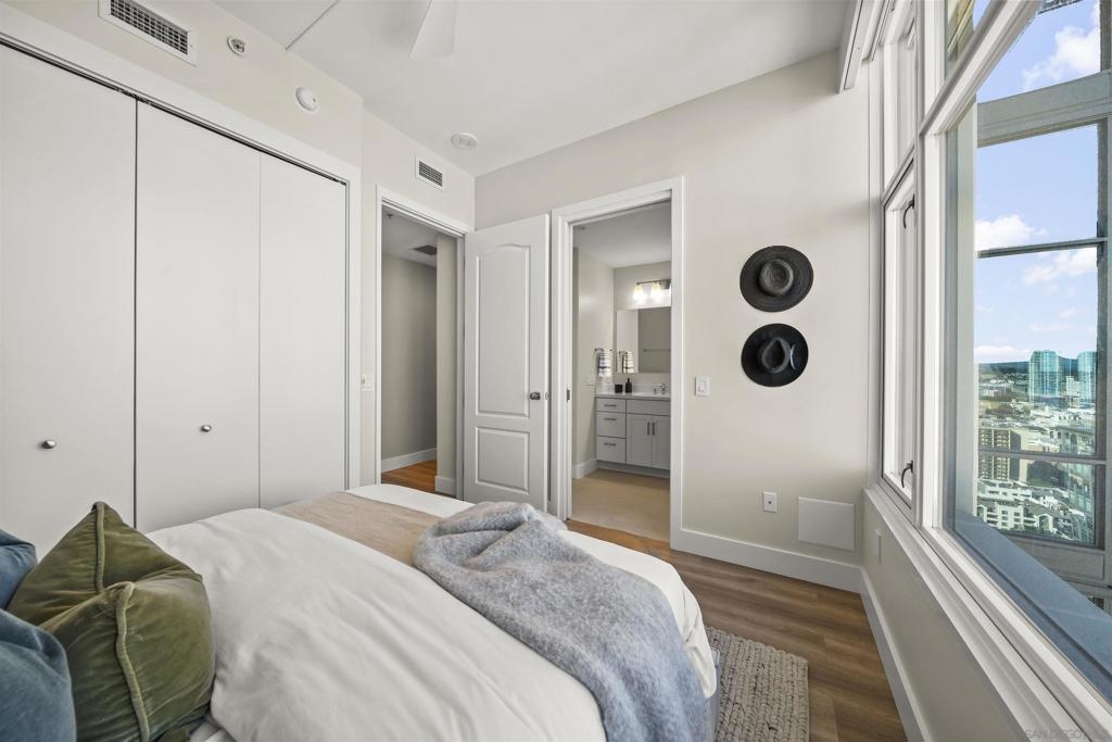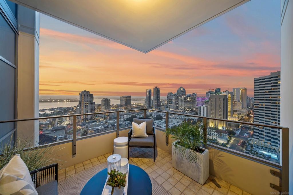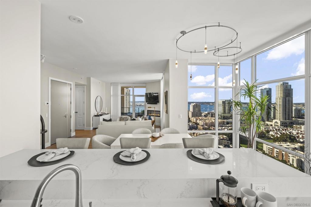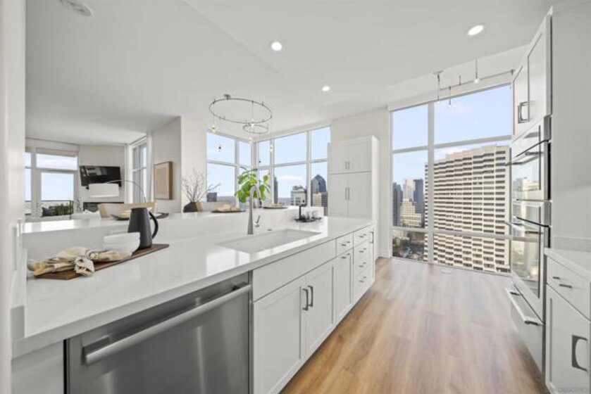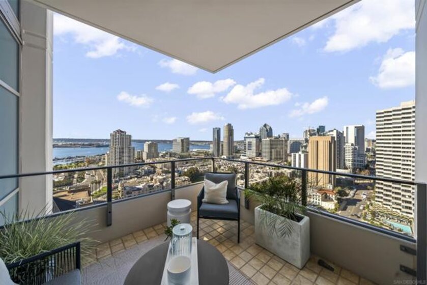 Step into luxury with this impeccably remodeled 2BR/2.5BA 23rd floor residence offering expansive West, North & East facing views! The grandeur of the space is accentuated by 10.5 ft ceilings + floor-to-ceiling windows, complemented by two private balconies perfect for soaking in San Diego's breathtaking sunsets, watching ships sail by, and admiring the views of Coronado Island and city lights. This residence has been recently remodeled with extensive upgrades including updated flooring throughout, modern kitchen cabinetry, Caesarstone countertops, state-of-the-art kitchen appliances + washer/dryer, California Closet built-ins, upgraded electrical + lighting, and more! Additionally, both bedrooms feature en-suite baths that have been fully remodeled, and there's a separate powder room for guests. Moments from Seaport Village, The Rady Shell, Gaslamp District and Petco Park, Pinnacle offers white-glove concierge service, a world-class gym, steam and sauna facilities, a guest suite, a stylish lounge, a 95 ft lap pool + spa & more. Residence #2303 also offers two underground parking spaces and a storage unit. This home epitomizes sophisticated urban living, with every detail thoughtfully considered and upgraded.