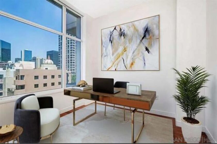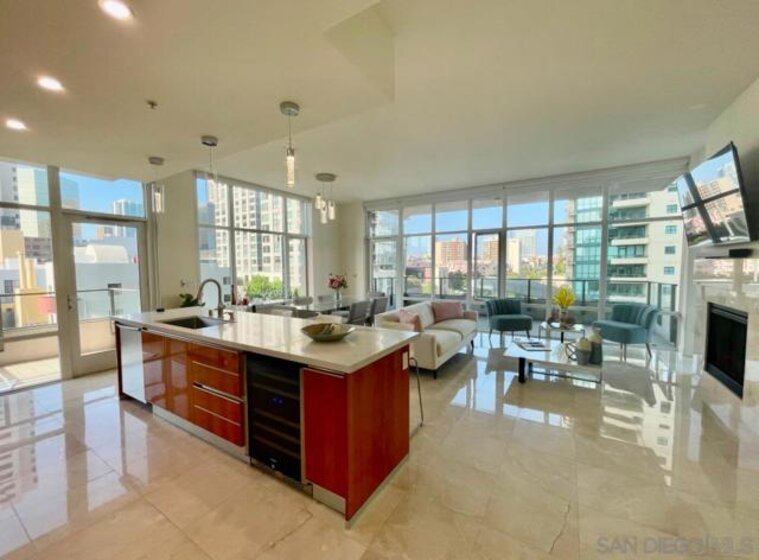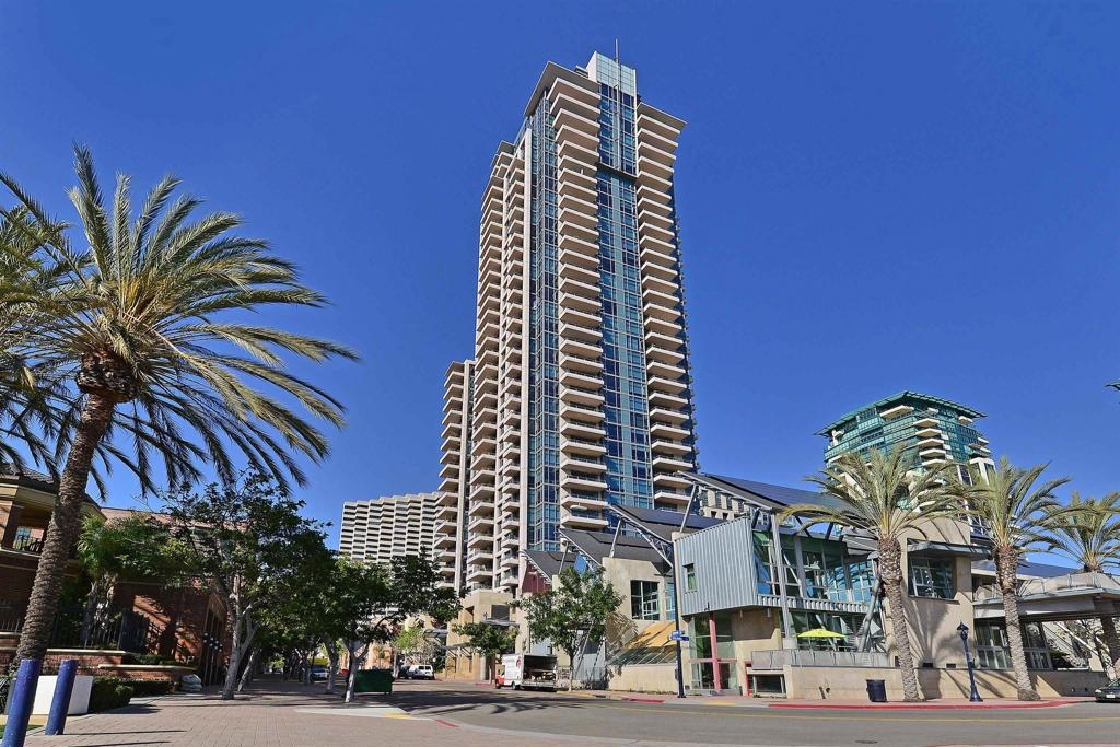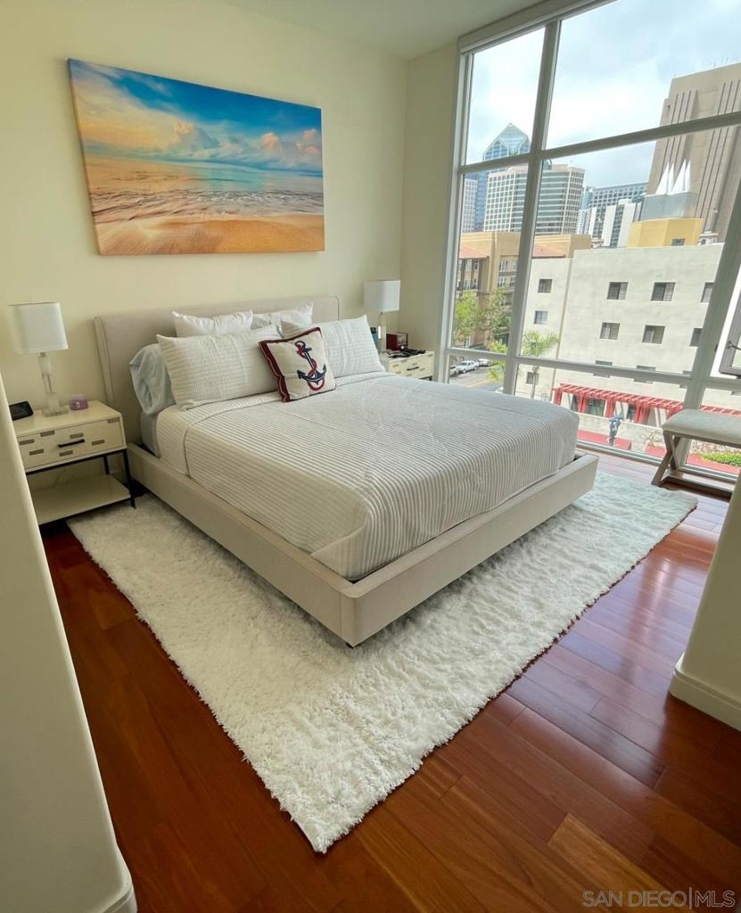 Luxury living at The Pinnacle. Bright NW corner 2-bed, 2-bath home with 10-ft floor-to-ceiling windows, motorized blinds, polished marble floors, and two private terraces offering sweeping 180-degree downtown views. Chef’s kitchen with new quartz counters, Italian Snaidero cabinetry, high end appliances, Sub-Zero fridge, and wine cooler. Features dual-zone HVAC, in-unit laundry, two parking spaces, and storage. Resort-style amenities include a 95' lap pool, sauna and steam room, clubhouse, fitness center, concierge, and guest suite. Ideal Marina District location near San Diego Bay, Seaport Village, the Gaslamp Quarter, and Ralphs. This renovated model features a chef’s kitchen with custom cabinetry, quartz countertops, and stainless steel appliances including a Sub-Zero refrigerator and wine cooler. Polished marble floors throughout, hardwood flooring in the bedrooms, and bathrooms finished with high-end materials and fixtures. 2 Bed/2Bath 1,297sf + Balconies 226sf = 1,523sf total.