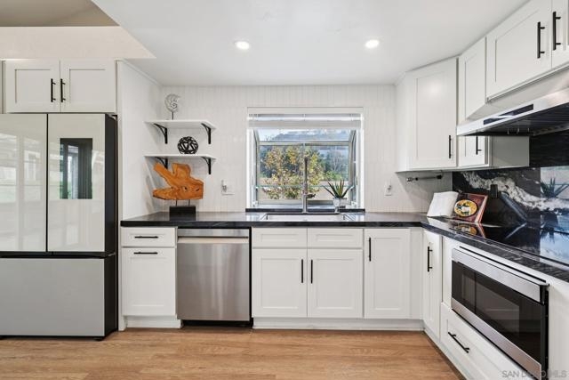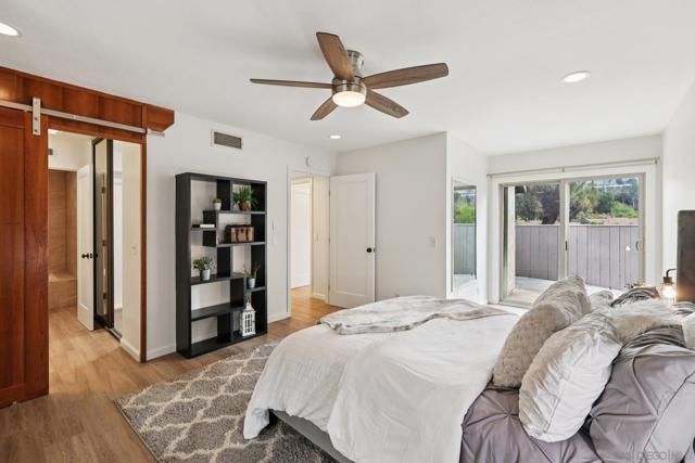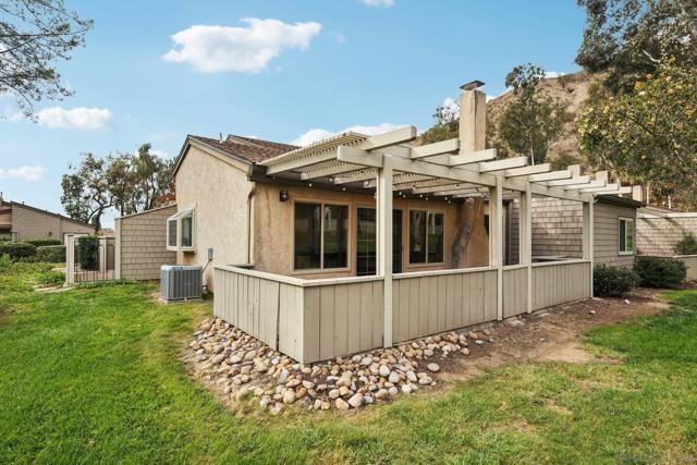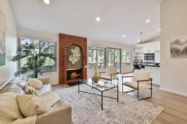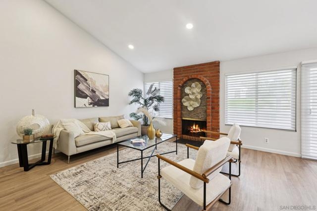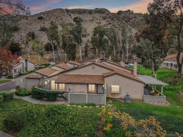 RARE CORNER UNIT SINGLE STORY HOME IN SMOKE TREE COMMUNITY * BEAUTIFULLY UPGRADED * MOUNTAIN AND SDSU VIEW * PAID OFF 15 PANEL SOLAR SYSTEM EV READY * 3 PATIOS AREA * 2 CAR GARAGE! Welcome to this rare single-story corner unit in the highly desirable Smoke Tree community, offering privacy, style, and effortless indoor-outdoor living. This beautifully updated three-bedroom, two-bath home features three separate patio areas, perfect for relaxing, gardening, or entertaining while enjoying a park-like setting with open mountain and SDSU views. The house is equipped with a paid-off 15-panel Baker Electric solar system and an EV-ready outlet, ensuring low energy costs and high convenience. Step inside to a bright, open layout with vaulted ceilings, recessed LED lighting, and custom motorized LEVOLOR window treatments in the living room. The living room features a cozy fireplace and seamless flow to the large patio with amazing views. The kitchen is a true showstopper, designed for the home chef, with a large center island, white shaker cabinetry, luxurious natural quartzite countertops, deep stainless steel sink, pull-out storage, and high-end stainless steel smart appliances, including a touchscreen LG refrigerator, induction cooktop, wine fridge, double ovens, and built-in microwave. The primary suite offers its own private patio, a walk-in closet, a barn-style door entry to the bathroom, a beautifully upgraded double sink vanity, and a soaking tub/shower combination. The secondary bathroom has been thoughtfully designed with custom finishes, imported fixtures, gold finishing, stunning wallpaper, and a walk-in glass shower with custom tile and a high-glass door. Additional features include newer windows, central HVAC with newer ductwork and insulation, a whole-house fan, a Nest smart thermostat, a Ring doorbell, upgraded doors with bronze hardware, and three ceiling fans. The attached two-car garage features laundry hookups with a washer and dryer (Kenmore Elite), ample storage space, and direct access to the patio and front door. The Smoke Tree community offers a resort-like pool, spa, and lush, park-like grounds, creating a serene environment while remaining close to everything. Just minutes from great hiking, SDSU, and the 8 freeway, a quick drive to downtown and San Diego's finest beaches.