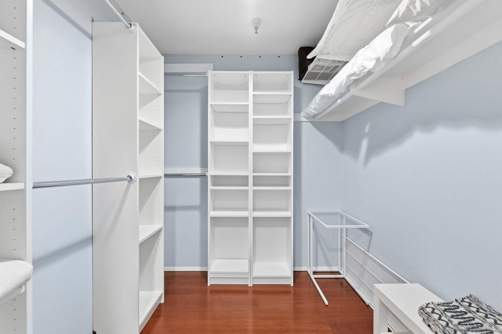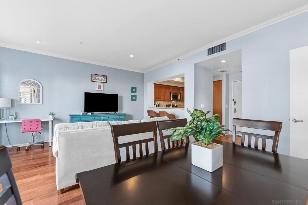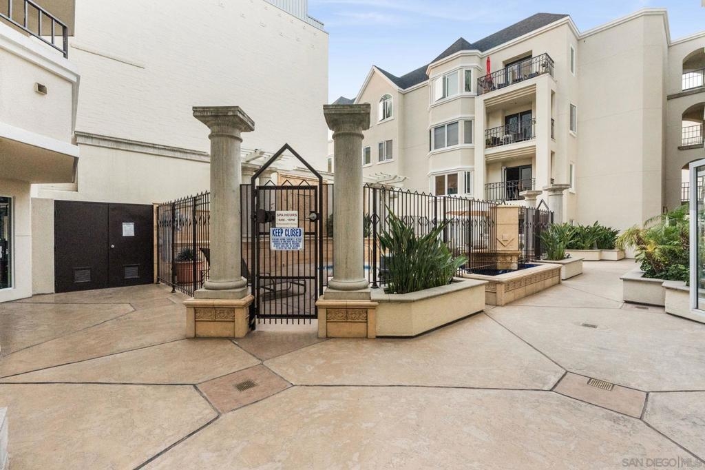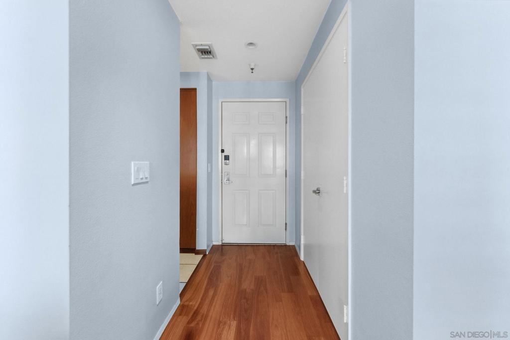 Welcome to Unit 317 at Columbia Place! Your peaceful downtown retreat in the heart of the Marina District! This spacious 1 bed, 1 bath condo offers the rare blend of privacy, walkability, and style. Enjoy dual access to a private balcony from both the living room and the primary bedroom, perfect for sipping coffee while taking in city light views. Inside, you'll find wood flooring, stainless steel appliances, warm wood cabinetry, and a dedicated dining area, living room, and bar seating. The updated bathroom features quartz countertops and a beautiful stone shower. The oversized walk-in closet offers endless possibilities! Use it for storage, or convert it into a home office or nursery. The unit includes in-unit laundry, newer HVAC (2022), and one assigned parking space. Columbia Place is a gated community with on-site security, a gym, and a jacuzzi. Best of all, you're just steps to Seaport Village, the marina, Gaslamp, Pantoja Park, restaurants, shops, and more. All without the downtown noise. Whether you're looking for a smart investment, a weekend getaway, or your full-time home base, this one has it all. (some images have been enhanced-added plants & towels).
