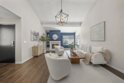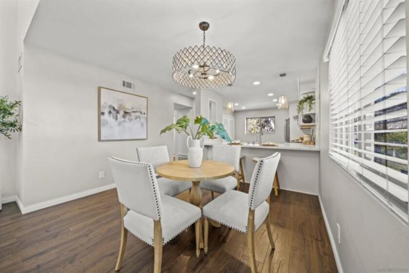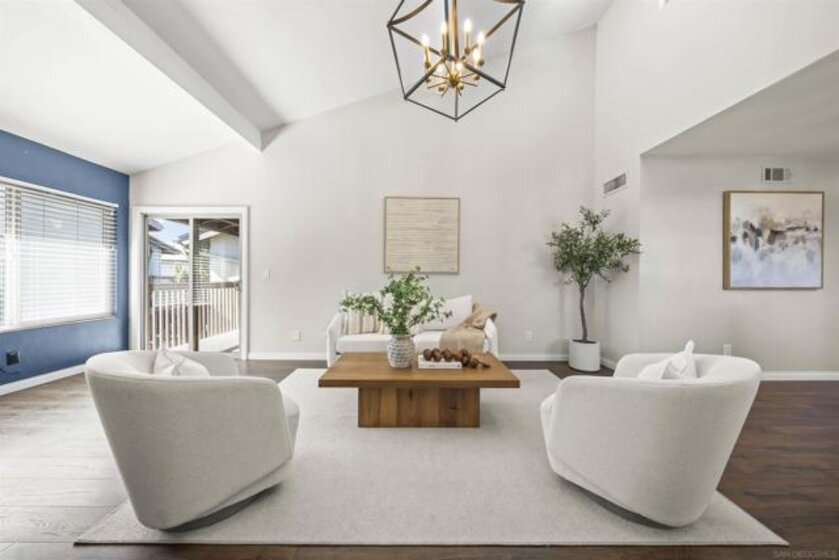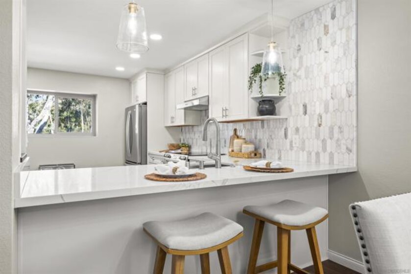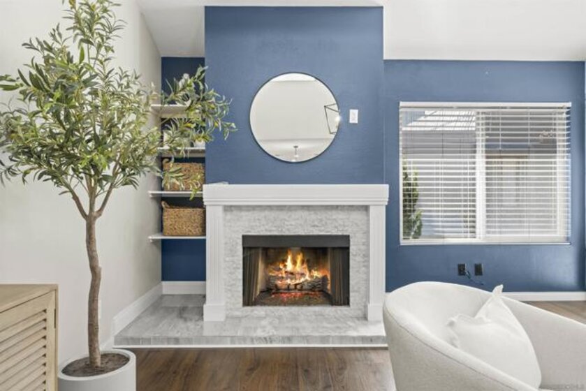 Stunning 2 bed, 2 bath end-unit home with sophisticated designer finishes throughout. Features luxury vinyl plank floor, chef’s kitchen with custom cabinets, marble backsplash, quartz countertops, & stainless steel appliances. Open-concept layout with high ceilings and living room fireplace. Spacious primary suite with custom closets, vanity area, luxury wallpaper & en-suite remodeled bathroom. Balcony access from primary bedroom & living room. Remodeled hall bath & second bedroom with mountain views. Includes in-unit washer/dryer, newer AC, tankless water heater, custom blinds, designer light fixtures, & 1 assigned parking space directly in front of unit plus 1-car garage. Community amenities include 2 pools, tennis courts, & clubhouse. Centrally located near schools, shopping, restaurants, parks, & freeways. VA & FHA APPROVED! HOA includes water, sewer & trash!