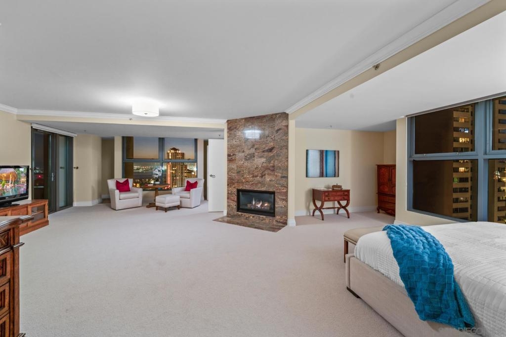 Almost 4,000 SF of panoramic and unobstructed western and northern views. Flooded with natural light through walls of telescopic windows which slide all the way open, showcasing spectacular views of the bay, ocean and city to Point Loma, and past Coronado. Corner residence boasts 3 huge bedrooms plus an office surrounded by glass walls with the most stunning views ever. Plus 4 balconies, 2 fire places, 2 parking spaces and 2 storage units. Renaissance will soon have a brand new “street level” lobby and new resort style amenities as seen in the Virtual Tour. Upon entering, you are welcomed by cathedral ceilings that enhance the light-filled, open layout. The FIRST LEVEL showcases gorgeous maple hardwood floors flow throughout the living area, complemented by telescopic windows that fully open, inviting the soothing ocean breeze inside. The family room, featuring eastern views, opens to the kitchen equipped with an island, an under counter wine cooler, ample storage, and a walk-in pantry. Enjoy three walk-out balconies on this level: two offering eastern views and one facing west for stunning sunsets. Two fireplaces enhance the ambiance: one in the living area on the first level and another in the primary bedroom suite. Convenient for your friends and family, a large guest suite provides unobstructed panoramic water and city views, complete with custom shutters for adjustable light control and includes a walk-in closet and an ensuite bathroom with a multi-jet shower. Plus a powder room convenient for your guests. SECOND LEVEL: Bedroom two features a spacious layout, a gigantic walk-in closet, and a walk-in shower. The expansive primary suite spans boasts nearly 900 square feet and includes crown molding throughout. The fireplace creates a cozy atmosphere, complemented by a comfortable sitting area by the bay facing window. Enjoy a luxurious Jacuzzi tub, dual sinks, and a multi-shower fixture in the primary ensuite catering to your every need. Adjacent to the primary suite is a large office with stunning north and west views through walls of glass, showcasing sparkling water and city lights, along with enhanced privacy. A spacious and private balcony directly off the primary suite offers uninterrupted water views, perfect for romantic evenings or enjoying a good book while watching boats, yachts, and the cityscape extending to the mountains. Two side-by-side parking spaces and two storage areas—one large cage and a temperature-controlled storage room for valuable items like artwork. Renaissance will soon have a brand new “street level” lobby and new resort style amenities including a large landscaped courtyard w/ BBQ aren, 3 fire pits w/ a dining area, pool/spa, gym, community lounge w/ full kitchen, conference room, surveillance throughout the community & 24/7 desk attendants. Ground floor retail conveniently includes Postal Annex for easy Amazon returns, Discount Nutrition & Vitality Juice, Rolling Out Bakery, Vases Salon, iTan and Wells Fargo. Located across from Ralph’s 24 hr. grocery w/ cafes on every corner, steps to the waterfront and Little Italy & just minutes to airport & public transportation and a ferry ride to Coronado. Welcome to paradise!