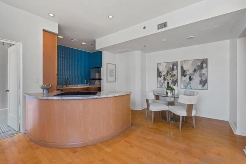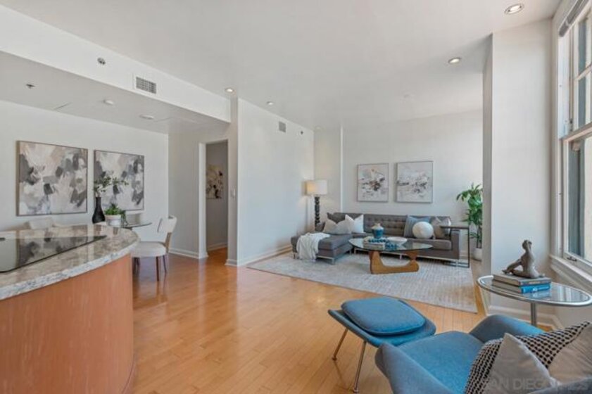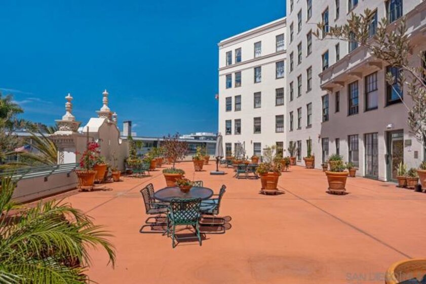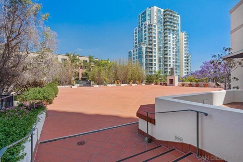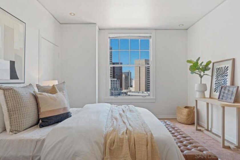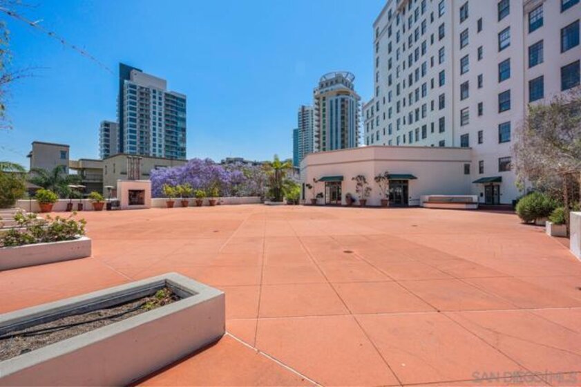 Perched within the iconic and highly sought-after El Cortez, this rare west facing one-bedroom, two-bath residence blends timeless character with modern comfort in downtown San Diego. This spacious layout offers an open living and dining area filled with natural light, soaring ceilings, and classic architectural details that honor the building’s storied heritage, all complemented by captivating views of downtown and the bay. The generously sized primary suite offers a walk in closet and additional storage, along with an en-suite full bathroom. The kitchen features updated countertops and a striking backsplash, adding a vibrant, contemporary touch. The inviting living area provides a functional and comfortable layout ideal for both everyday living and entertaining while a second full bathroom offers added convenience for guests. Custom recessed lighting throughout elevates the space. El Cortez amenities include a pool, fitness center, and the beautifully landscaped gardens that define this landmark property. Located just steps from Balboa Park, Little Italy, and Gaslamp Quarter, this home offers an exceptional blend of historic charm and urban convenience. With the Mills Act in place, this property also offers significant property tax savings. A rare opportunity to own a true piece of San Diego history!