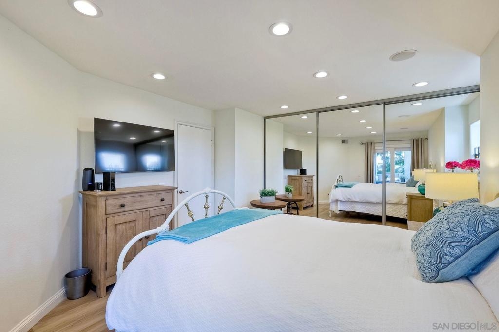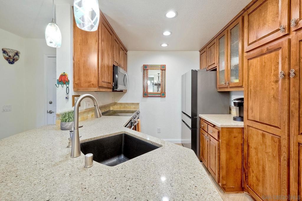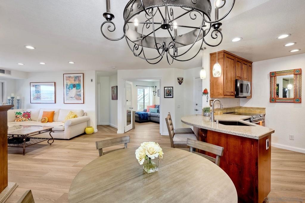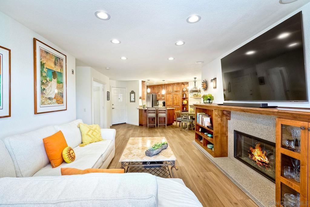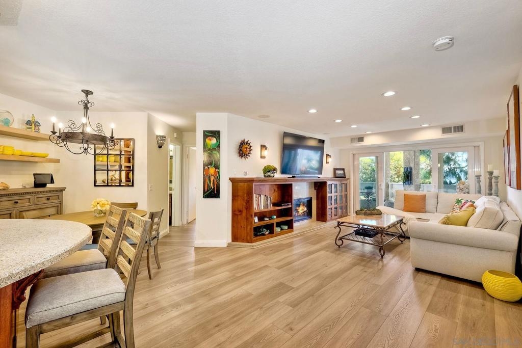 A rare find located in the heart of San Diego. This is a one level, end unit condo w/ no stairs to and from the unit, parking lot and two car tandem garage and yes, it's absolutely gorgeous! There are 3 bed, 2 bath, an open floorplan w/ all rooms leading onto a spacious, covered relaxing patio w/ unobstructed views. The bedrooms are generous in size, triple door closets, luxury vinyl planks throughout, fireplace in living room, new LED recessed lighting, upgraded bath vanities and shower, upgraded kitchen cabinets & Silestone countertops. City Scene complex comes w/ access to pool, spa, BBQ and exercise room and HOA fees include water and trash. Location, Location, Location! Fashion Valley Mall across the street, Snapdragon Stadium, USD, SDSU, Mesa College, Downtown, Beaches, Hospitals, SD Airport all close by.