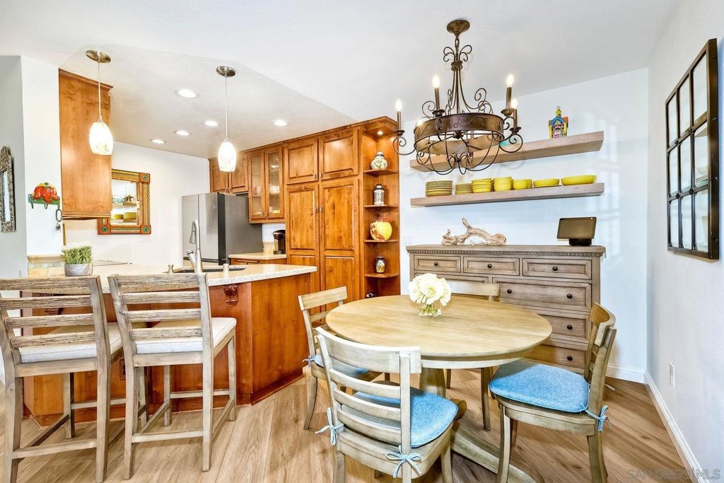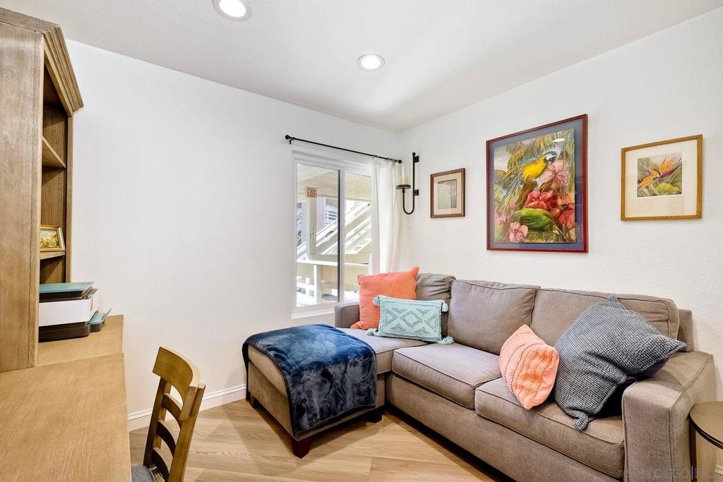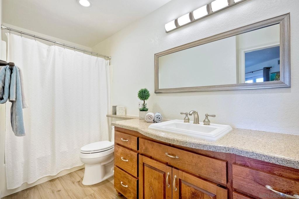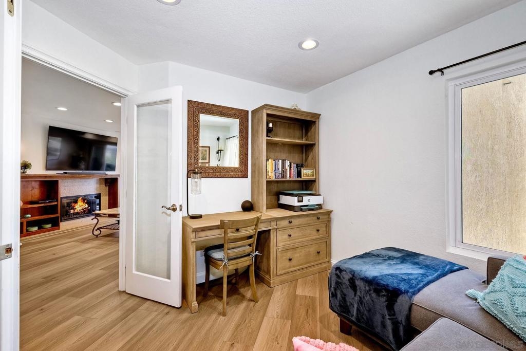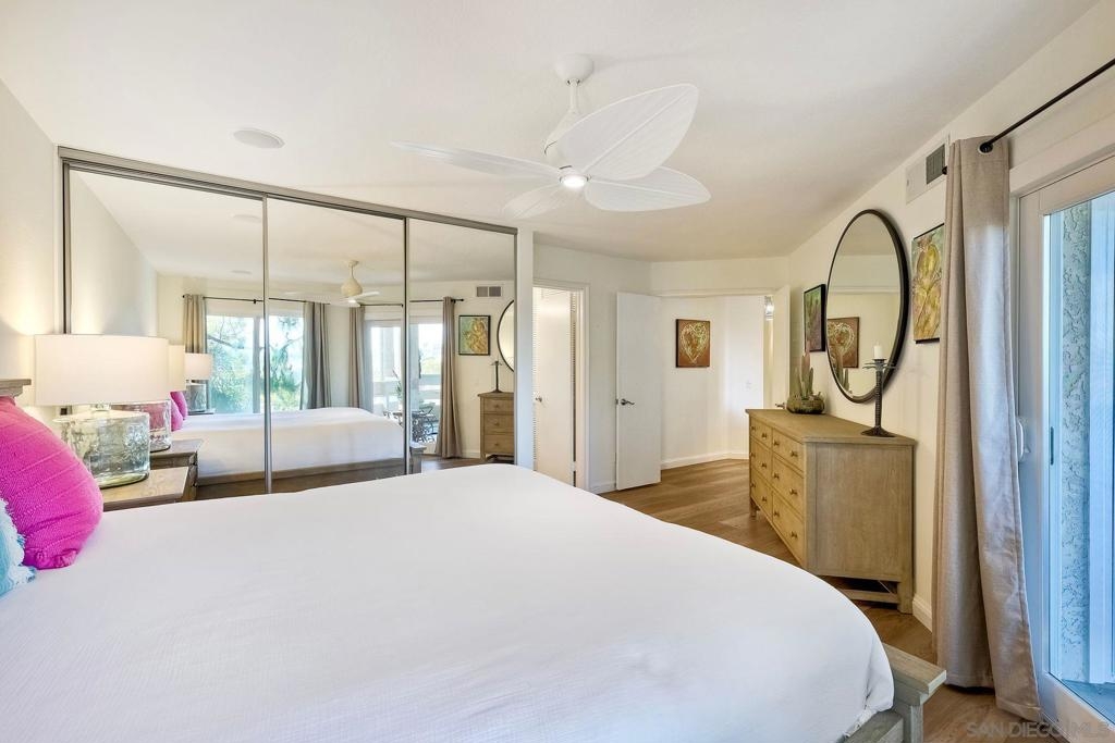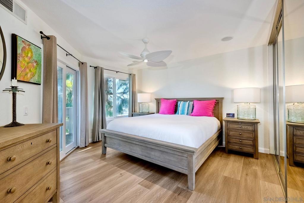 A rare find located in the heart of San Diego. This is a one level, end unit condo w/ no stairs to and from the unit, parking lot and two car tandem garage and yes, it's absolutely gorgeous! There are 3 bed, 2 bath, an open floorplan w/ all rooms leading onto a spacious, covered relaxing patio w/ unobstructed views. The bedrooms are generous in size, triple door closets, luxury vinyl planks throughout, fireplace in living room, new LED recessed lighting, upgraded bath vanities and shower, upgraded kitchen cabinets & Silestone countertops. City Scene complex comes w/ access to pool, spa, BBQ and exercise room and HOA fees include water and trash. Location, Location, Location! Fashion Valley Mall across the street, Snapdragon Stadium, USD, SDSU, Mesa College, Downtown, Beaches, Hospitals, SD Airport all close by.