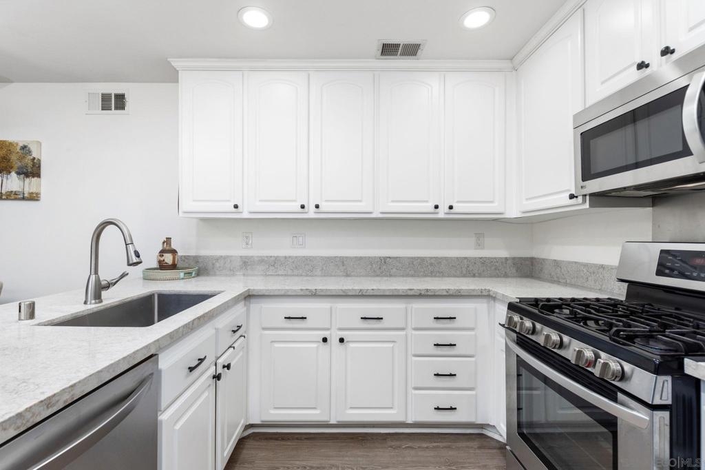 Price Just Reduced! Enjoy a spacious layout with a large balcony overlooking a serene, tree-lined greenbelt—perfect for relaxing or entertaining Tucked away in the peaceful Concord Square community of Mira Mesa, this top-floor end unit offers comfort, style, and privacy. Inside, you'll find newer LVP flooring and carpet, beautifully remodeled bathrooms, and a bright kitchen featuring crisp white cabinetry, stone countertops, a gas stove, and a refrigerator that stays. The designated laundry room includes a washer and dryer for your convenience. Additional upgrades include window shutters, recessed lighting, and recent exterior improvements, with the roof replaced and building freshly painted within the last year. Community amenities include a pool and spa, all just minutes from shopping, dining, parks, highly rated schools, and convenient access to Interstate 15.