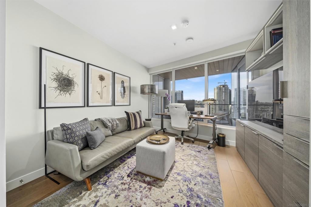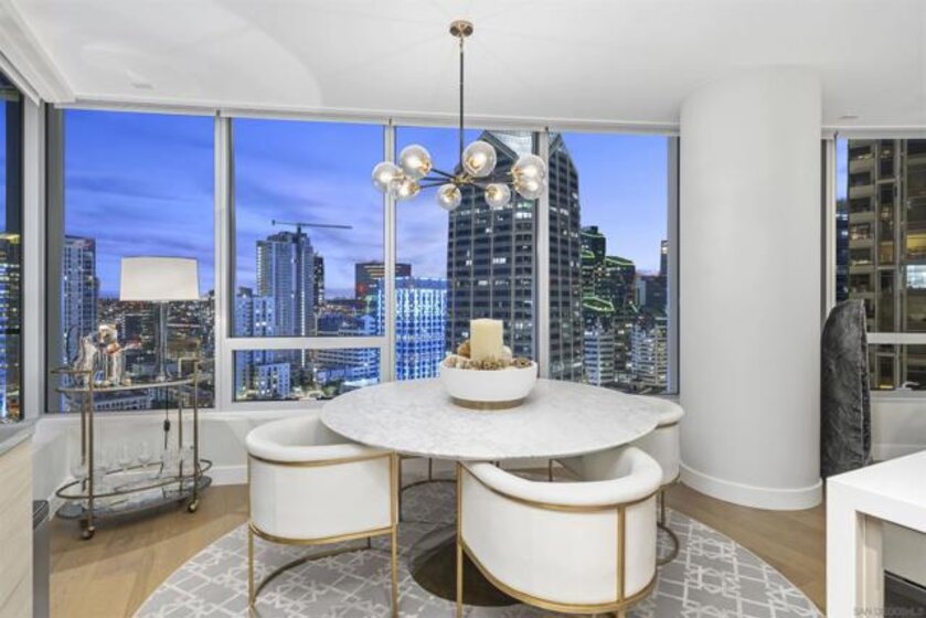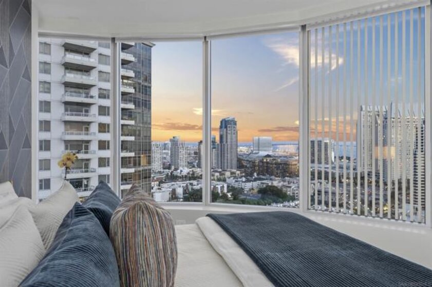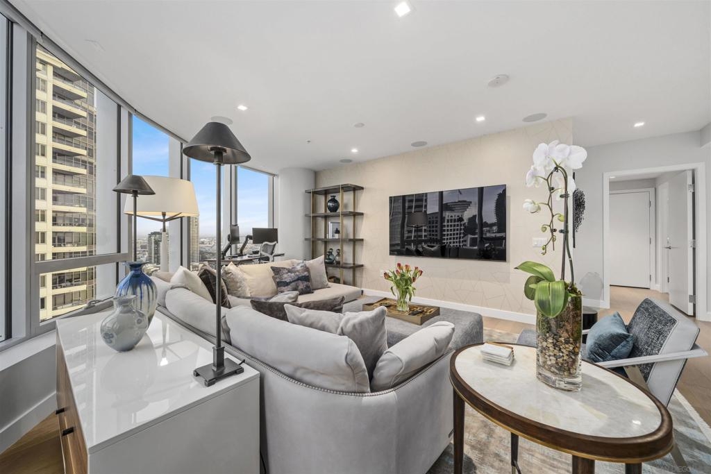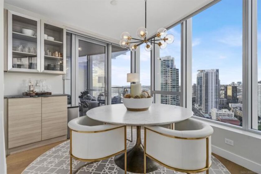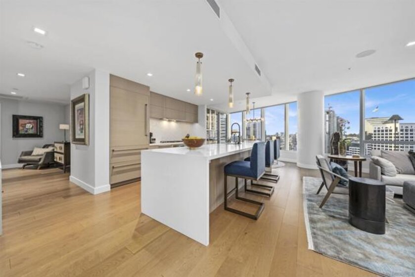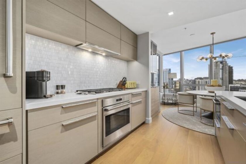 Perched on the 24th floor of Pacific Gate, Residence 2405 offers a rare corner layout with sweeping views of the downtown skyline, San Diego Bay and the Coronado Bridge. This 2BR/2BA residence features an open concept design with expansive windows and views from every room. The large private terrace is uniquely protected from wind while capturing stunning city lights and bay views, perfect for year-round indoor-outdoor living. The home is enhanced with premium upgrades including wood flooring throughout, heated primary bathroom floors and integrated smart home controls for lighting, climate and motorized shades. The modern kitchen showcases power-operated cabinets and a hidden built-in dog feeding station. Designer wallpaper adds a custom, sophisticated touch to the living room and primary suite. Both bedrooms feature custom closets by California Closets. The guest bedroom also includes a custom media and storage center, ideal for guests, a home office or flex space. Designed by Kohn Pedersen Fox, Pacific Gate offers a chef concierge, private yacht access, luxury car fleet, pool/spa, fitness center, steam/sauna, theater, business center and dog retreat.