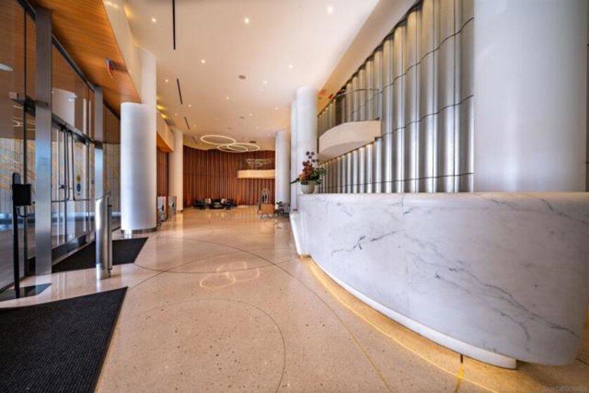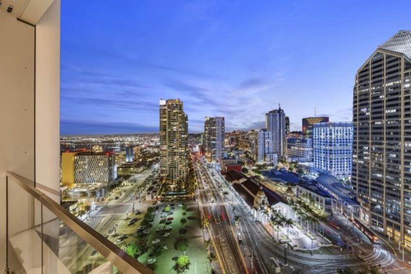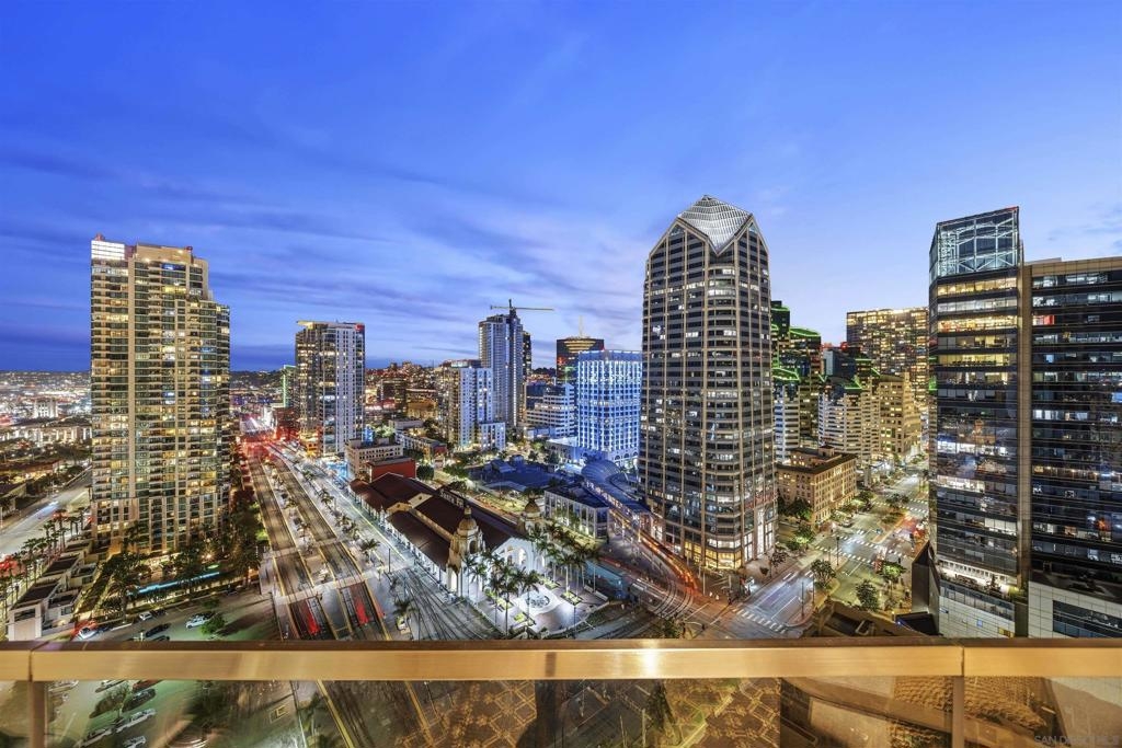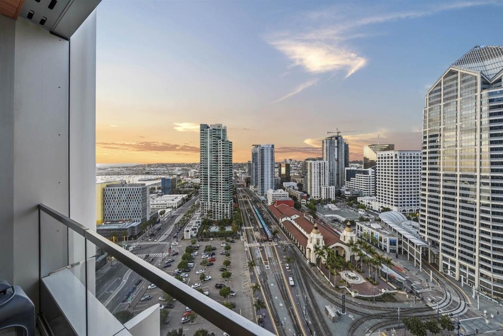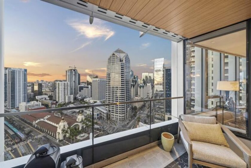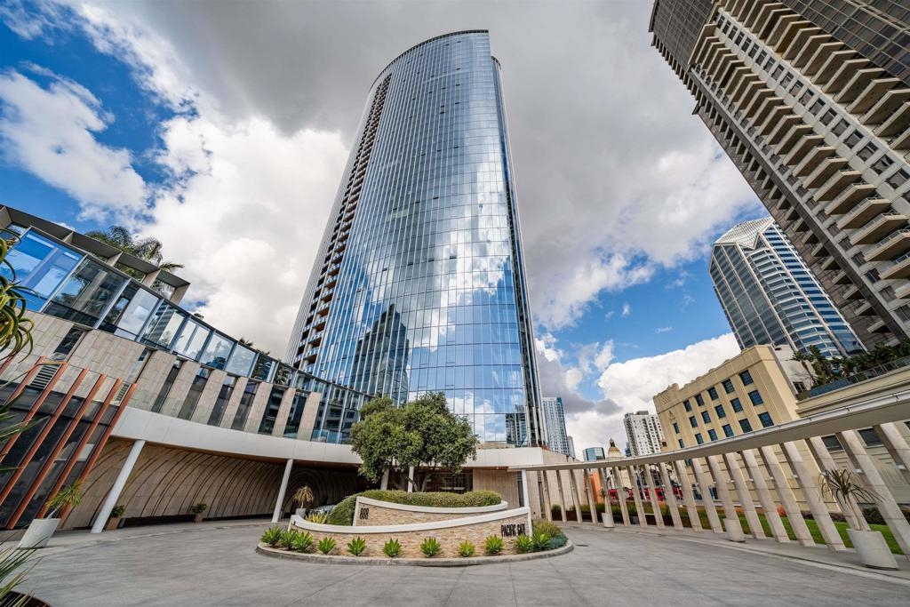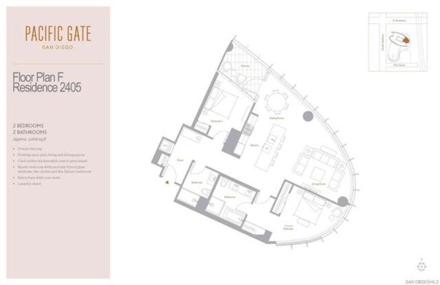 Perched on the 24th floor of Pacific Gate, Residence 2405 offers a rare corner layout with sweeping views of the downtown skyline, San Diego Bay and the Coronado Bridge. This 2BR/2BA residence features an open concept design with expansive windows and views from every room. The large private terrace is uniquely protected from wind while capturing stunning city lights and bay views, perfect for year-round indoor-outdoor living. The home is enhanced with premium upgrades including wood flooring throughout, heated primary bathroom floors and integrated smart home controls for lighting, climate and motorized shades. The modern kitchen showcases power-operated cabinets and a hidden built-in dog feeding station. Designer wallpaper adds a custom, sophisticated touch to the living room and primary suite. Both bedrooms feature custom closets by California Closets. The guest bedroom also includes a custom media and storage center, ideal for guests, a home office or flex space. Designed by Kohn Pedersen Fox, Pacific Gate offers a chef concierge, private yacht access, luxury car fleet, pool/spa, fitness center, steam/sauna, theater, business center and dog retreat.