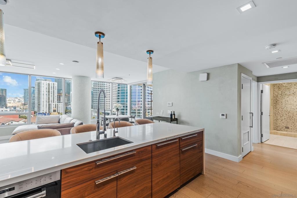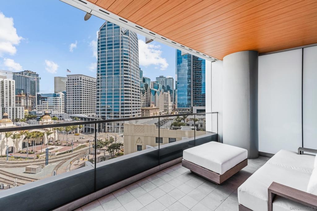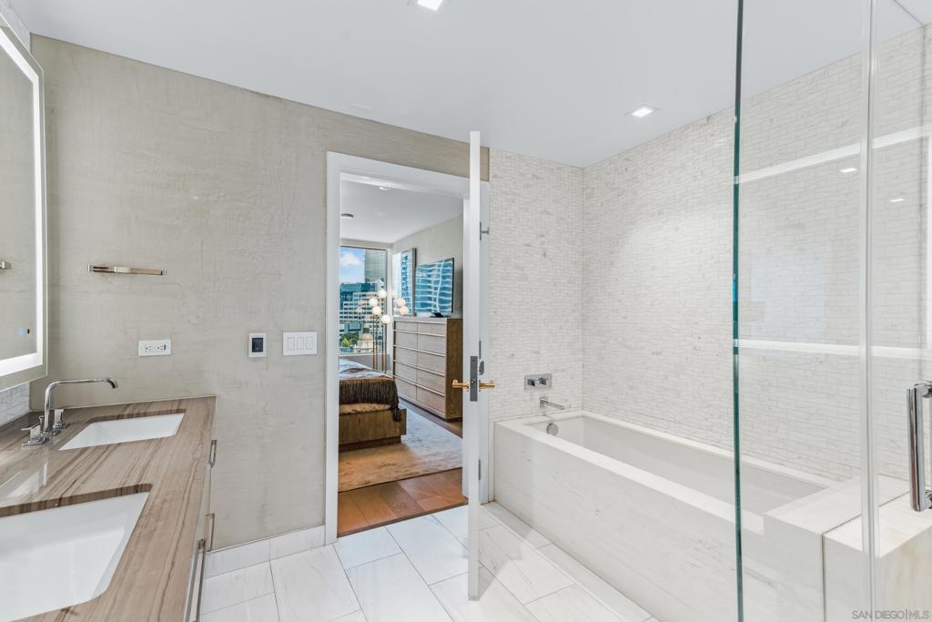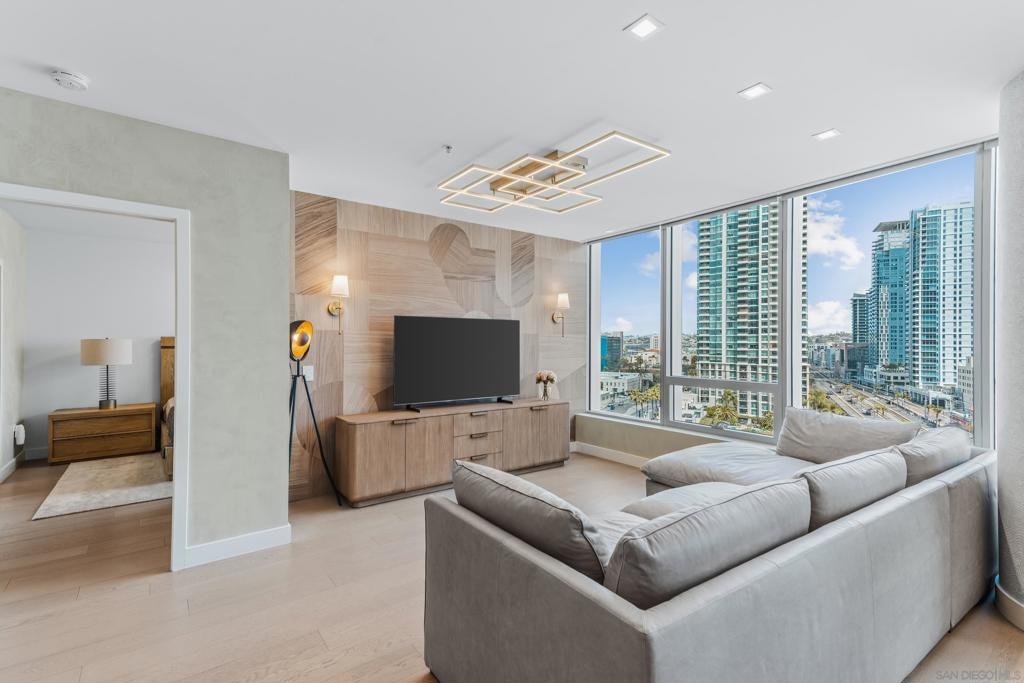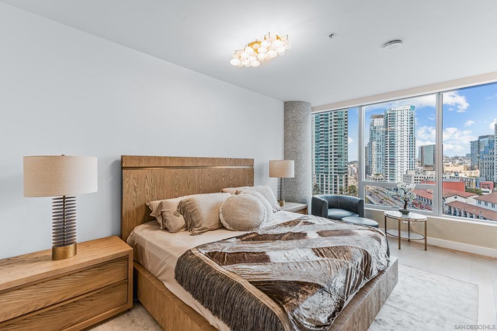 Experience the ultimate in luxury high-rise living at Pacific Gate, San Diego’s iconic waterfront address. Residence 1106 is a stunning 2-bedroom, 2-bath home spanning 1,390 sq. ft., offering an elegant blend of modern design and urban comfort. Expansive glass walls fill the home with natural light, showcasing dynamic city views framed by the downtown skyline. The open-concept living space features sophisticated upgrades like new wall coverings, fresh paint, and stylish lighting enhancements for added comfort and style. A split-bedroom layout ensures privacy and flexibility, while the private covered terrace extends your living area outdoors. The generous primary suite offers an elegant walk-in closet by California Closet Systems and a spa-inspired bath with heated floors, a walk-in shower, a soaking tub, and an anti-fog electric mirror with an integrated 10” TV screen. Automated blinds and a Smart Home system with climate control add convenience throughout the residence. The second bedroom offers flexibility as a home office or guest retreat. Residents enjoy unparalleled resort-style amenities including a private yacht share, luxury car fleet, chef concierge, guest suite, state-of-the-art fitness center with sauna and steam room, residents’ lounge, and an on-site restaurant led by a celebrity chef. Ideally located just steps from the bay, this residence is moments from Seaport Village, the Rady Shell, the new RaDD development, and San Diego’s finest dining, shopping, and entertainment. The first all-glass Super Prime residential tower in San Diego offers an unprecedented waterfront lifestyle with sky-high amenities and picture-postcard views. Directly overlooking the waterfront, the 41-story tower contains an exclusive offering of homes designed by Hirsch Bedner Associates. Renowned New York-based architectural firm Kohn Pedersen Fox (KPF) created a landmark that reimaged the San Diego skyline. The custom-engineered glass walls dynamically reflect the hues of the sky and the Pacific Ocean. Pacific Gate has evolved the San Diego skyline and represents the future of the city. The building is comprised of two-nested curved glass towers that rise as a single column from a three-story ground floor retail podium on the north and west sides of the tower. Because of the building’s curves and exterior glass, Pacific Gate offers a striking viewing experience from every vantage point. Residents arrive home to a beautifully landscaped motor court with a private luxury car fleet, which leads to a double-height lobby with a 24-hour concierge and porter services. Two levels of amenities boast a residents lounge ideal for events and everyday use, the fitness center contains an extensive range of state-of-the-art equipment. Adjacent to the fitness center is the steam and sauna retreats that open up to the fourth-floor pool terrace fitted with poolside cabanas and glass surround.